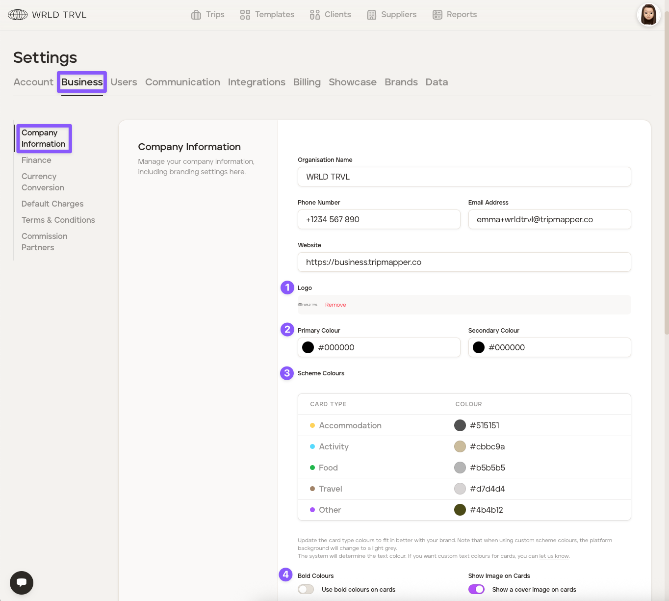 Keep TripMapper's default itinerary item card colours, or add your own colours to align with your company branding.