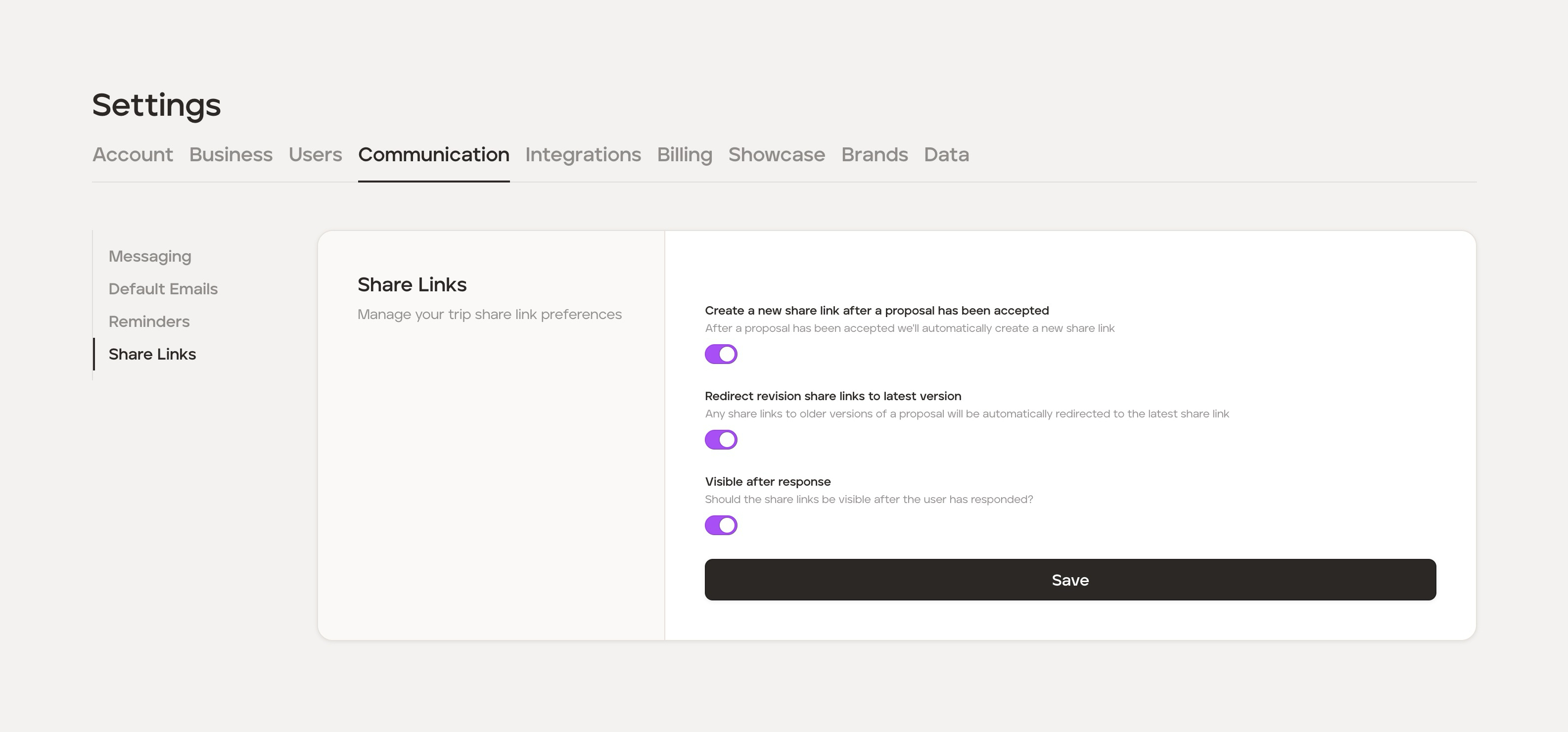 Within 'Settings', under the 'Communication' tab, you'll find a 'Share Links' section with three default settings that control how share links behave across all new proposals. These settings can save you time and reduce the need to manually manage links after a proposal has been accepted.