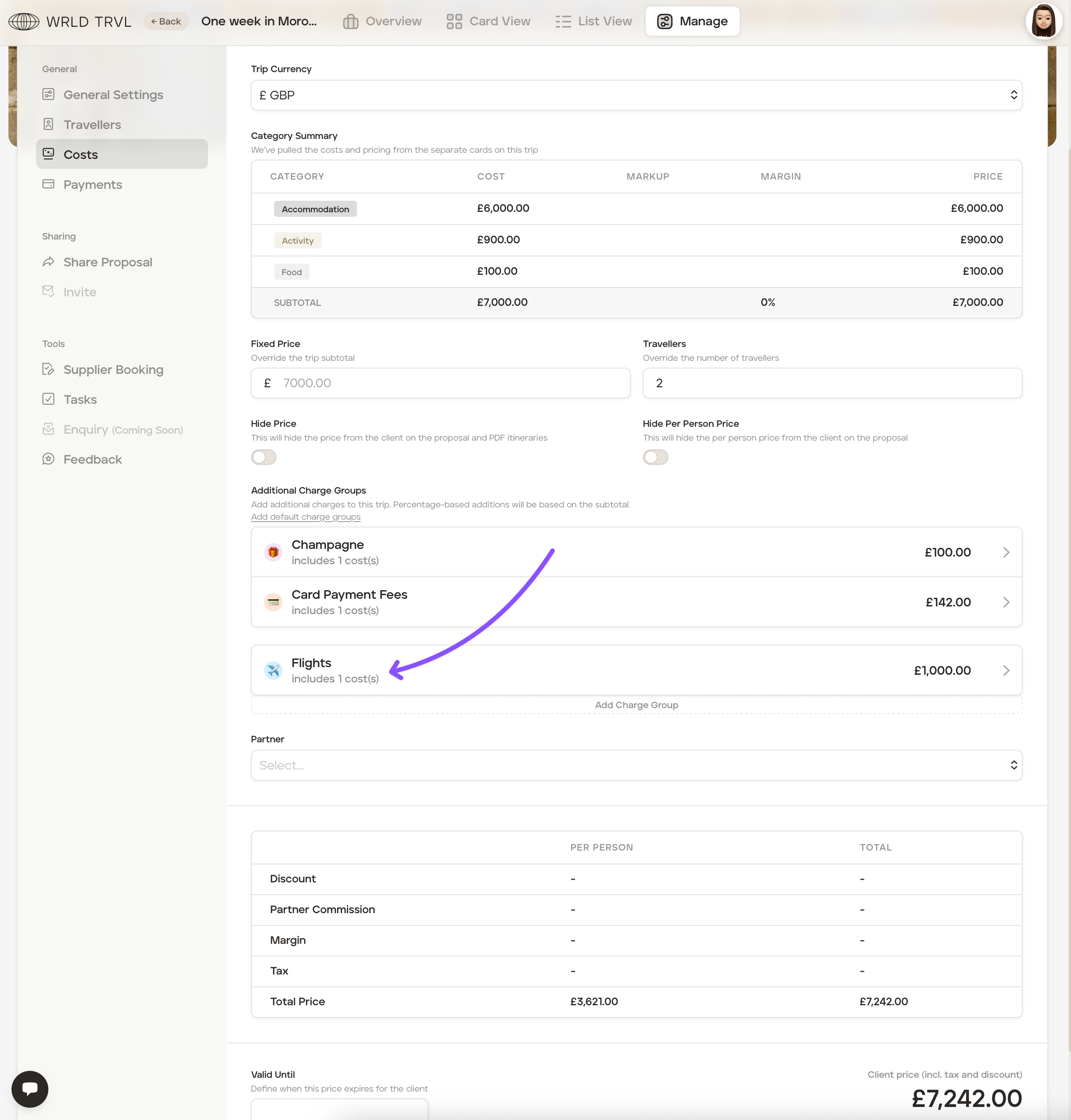 If your client is going to be sent the proposal for review and approval, they will see the optional charge and can approve by ticking the optional item check box. If approved by the client, the total trip price will include the optional charge.