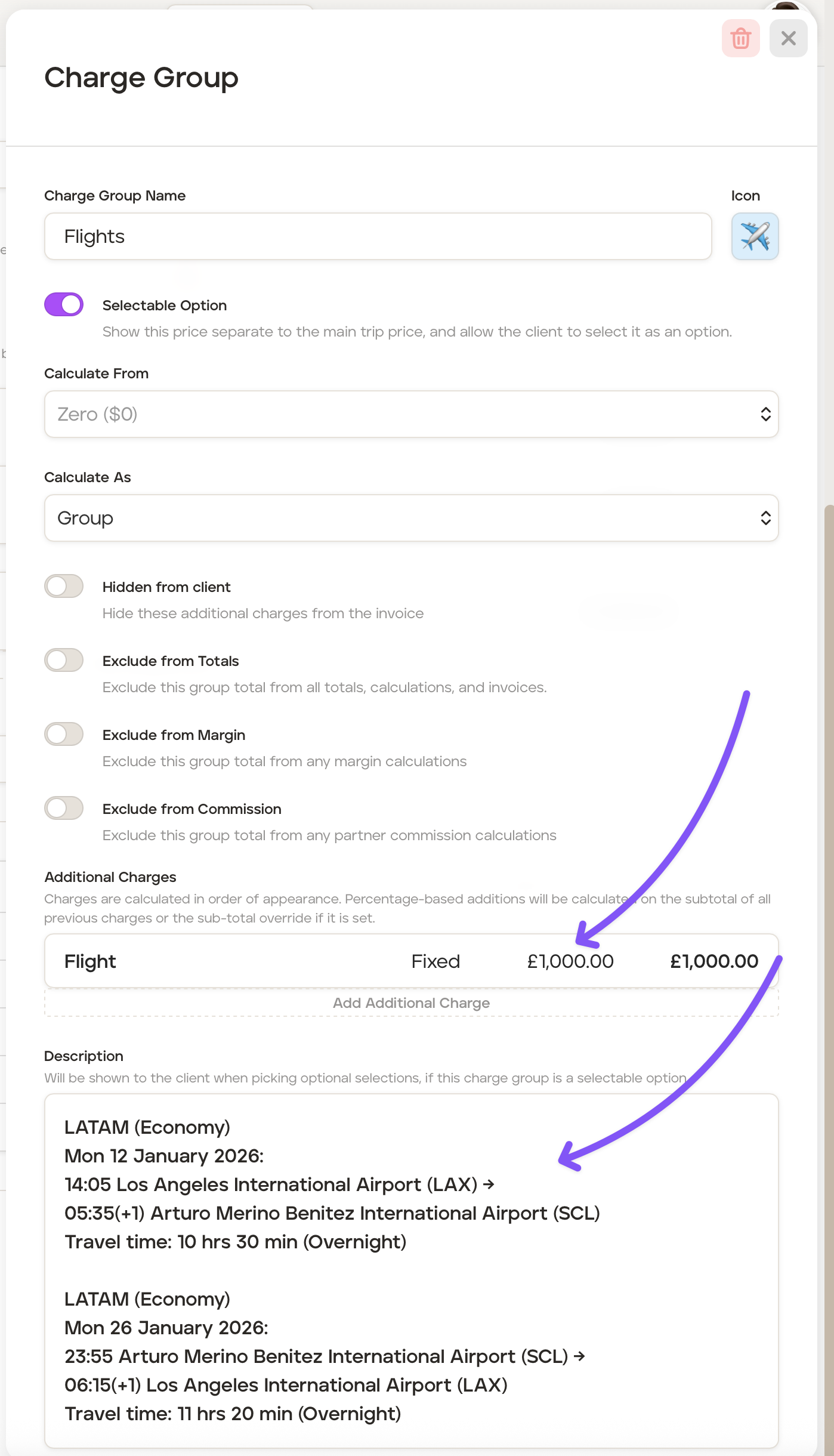 Add a group name in the 'Charge Group Name' field, for example, 'Flights'.