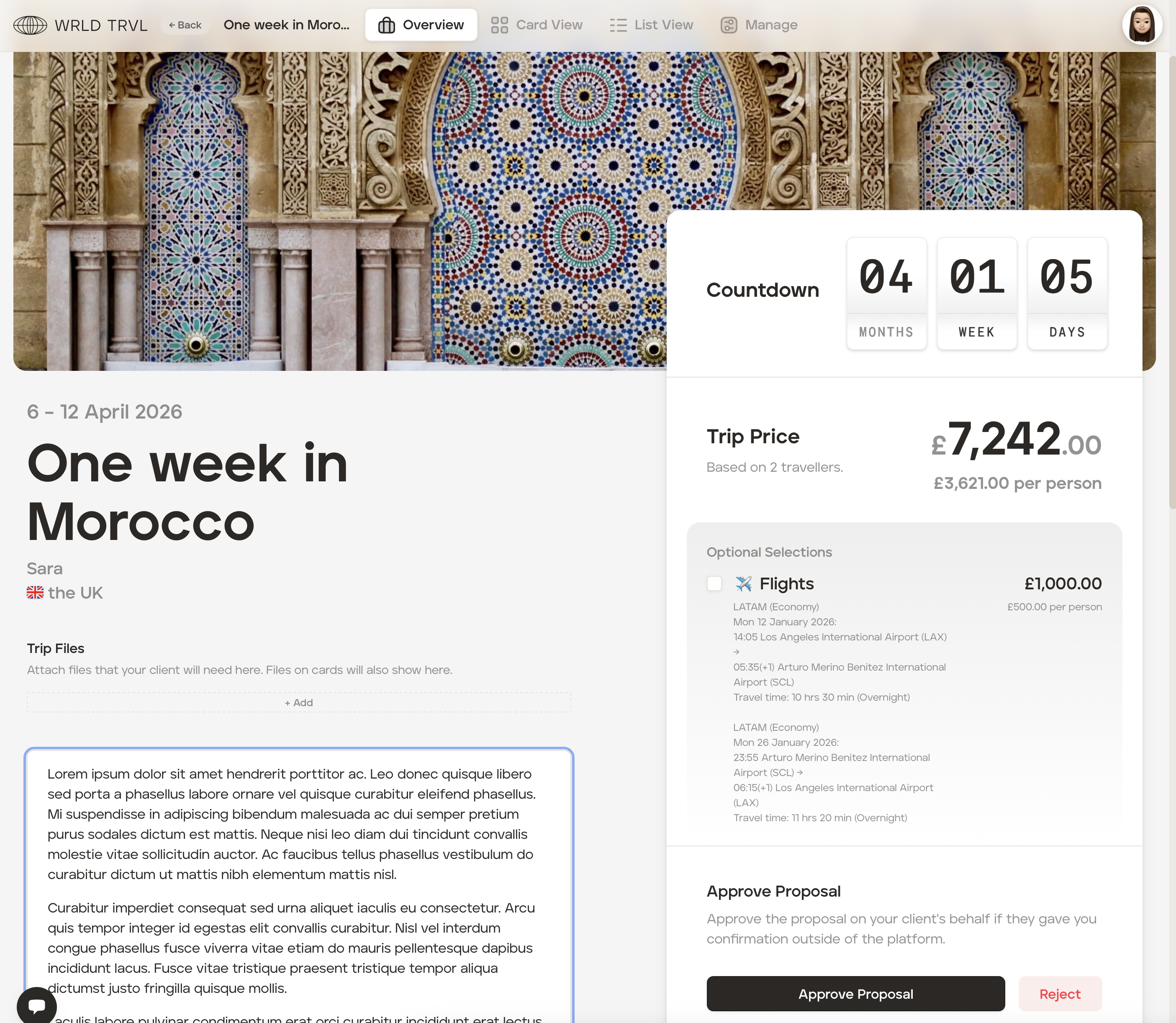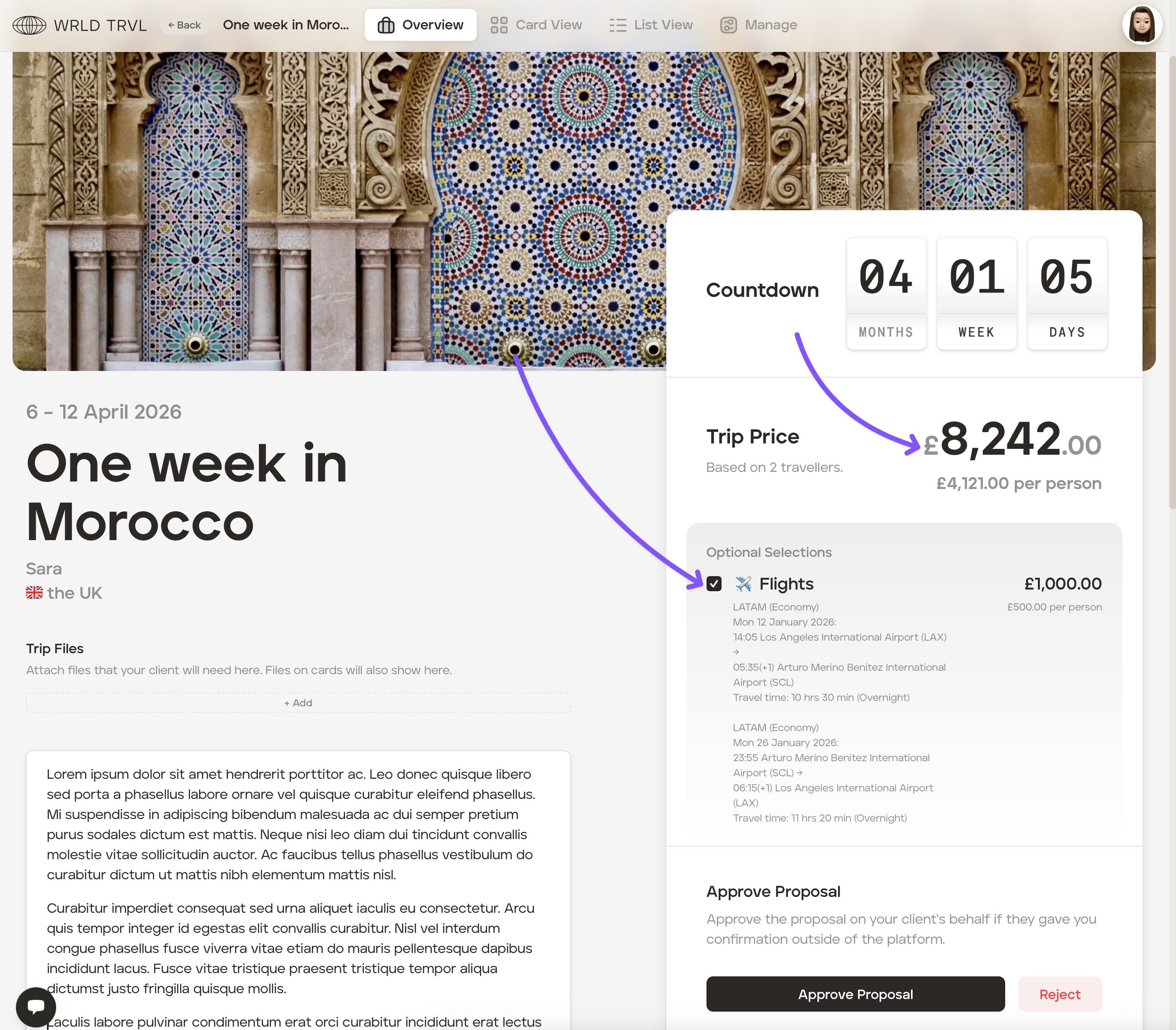If you are approving the option on your client's behalf, you can 'tick' the check box before approving the proposal. If approved, the total trip price will include the optional charge: