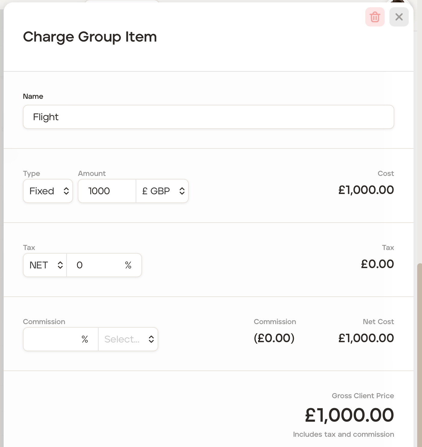Once all details have been added, click the 'X' in the top right corner to be taken back to the 'Costs' screen, which will now also show the optional charge:
