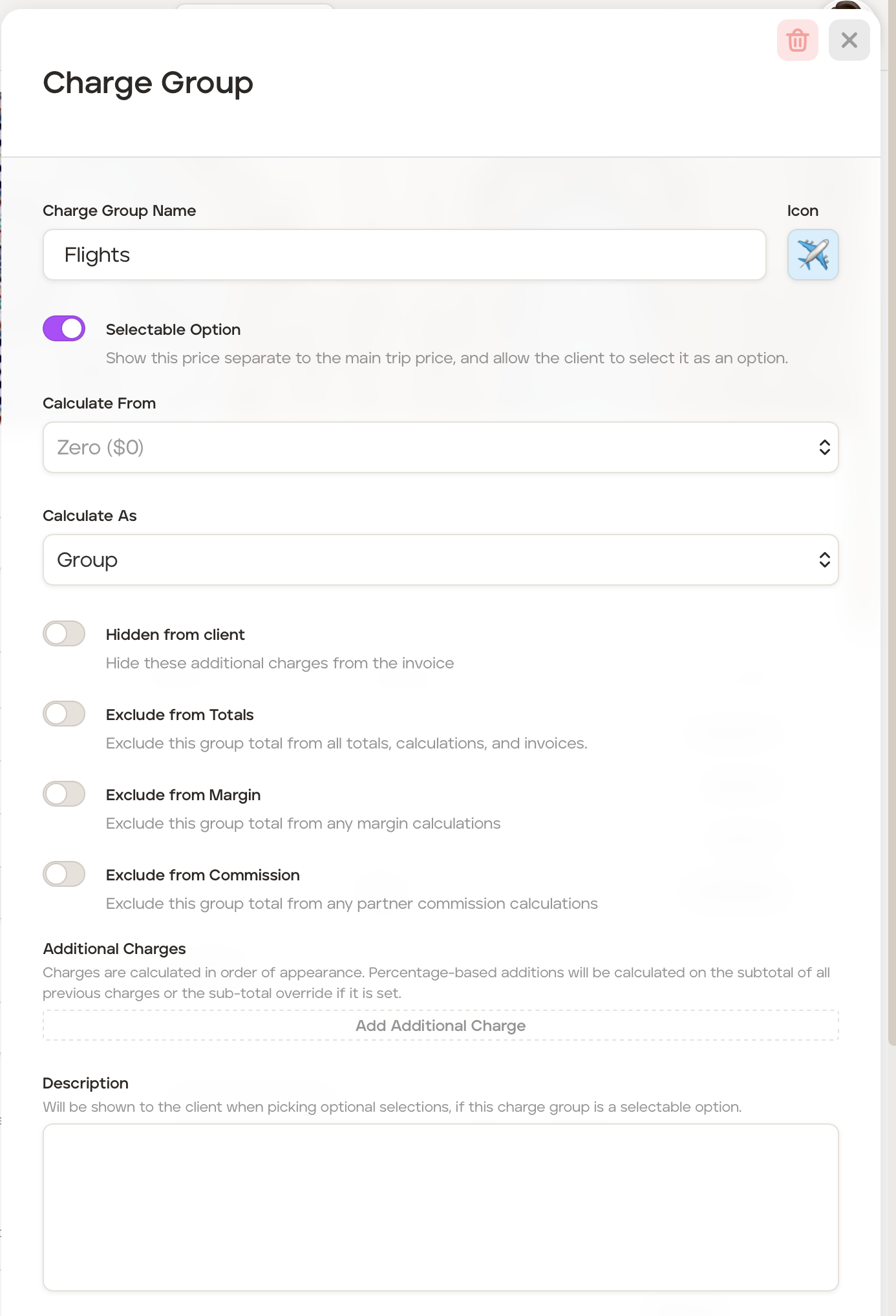 In the 'Calculate From' field, it will automatically be set to 'Zero ($0)'. This will calculate the additional charge from zero and not use any values from itinerary cards costs or client prices.