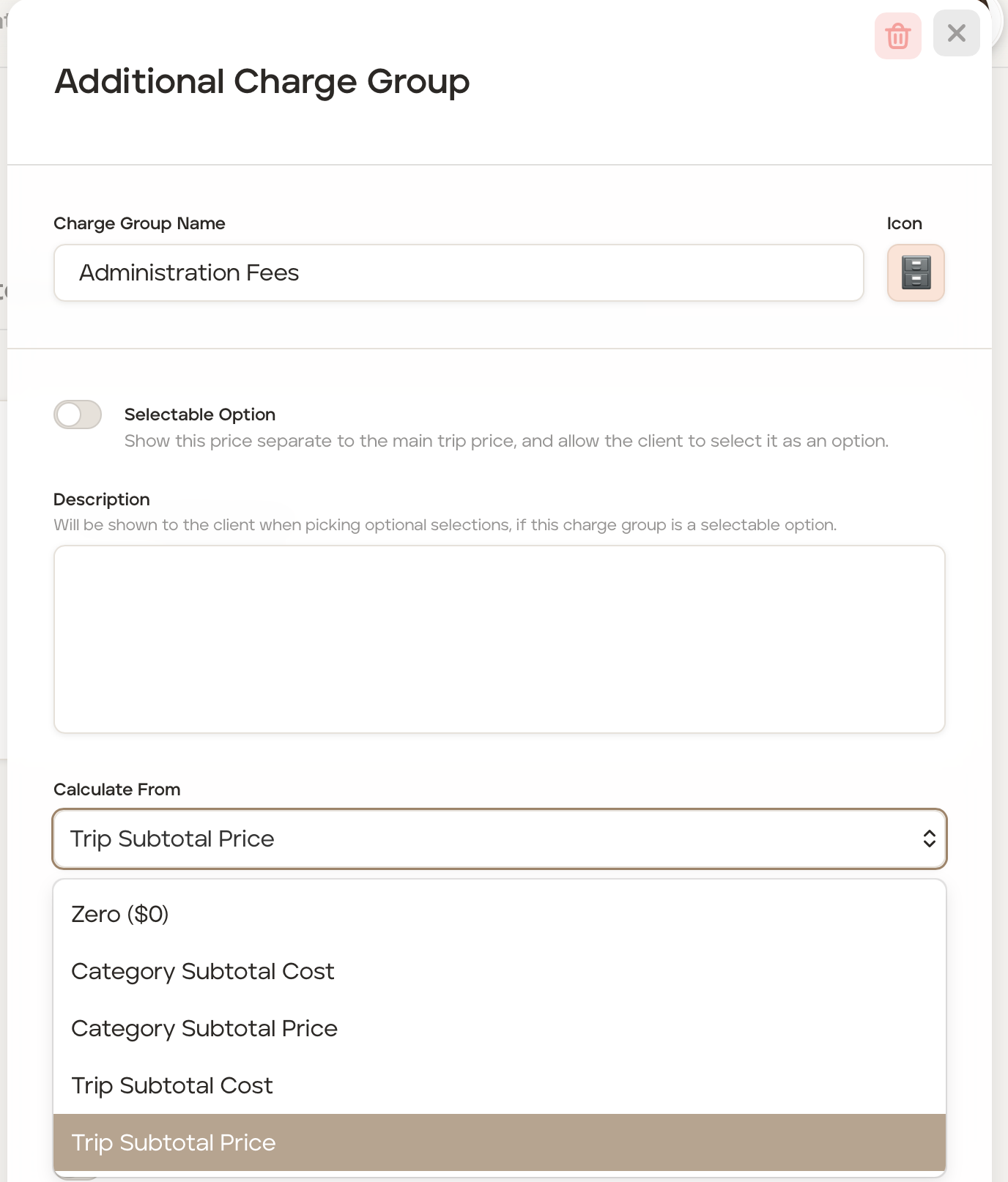 Trip Subtotal Price - This will calculate the additional charge from the entire trip subtotal client price (ie. all itinerary card client prices plus any other additional charges).