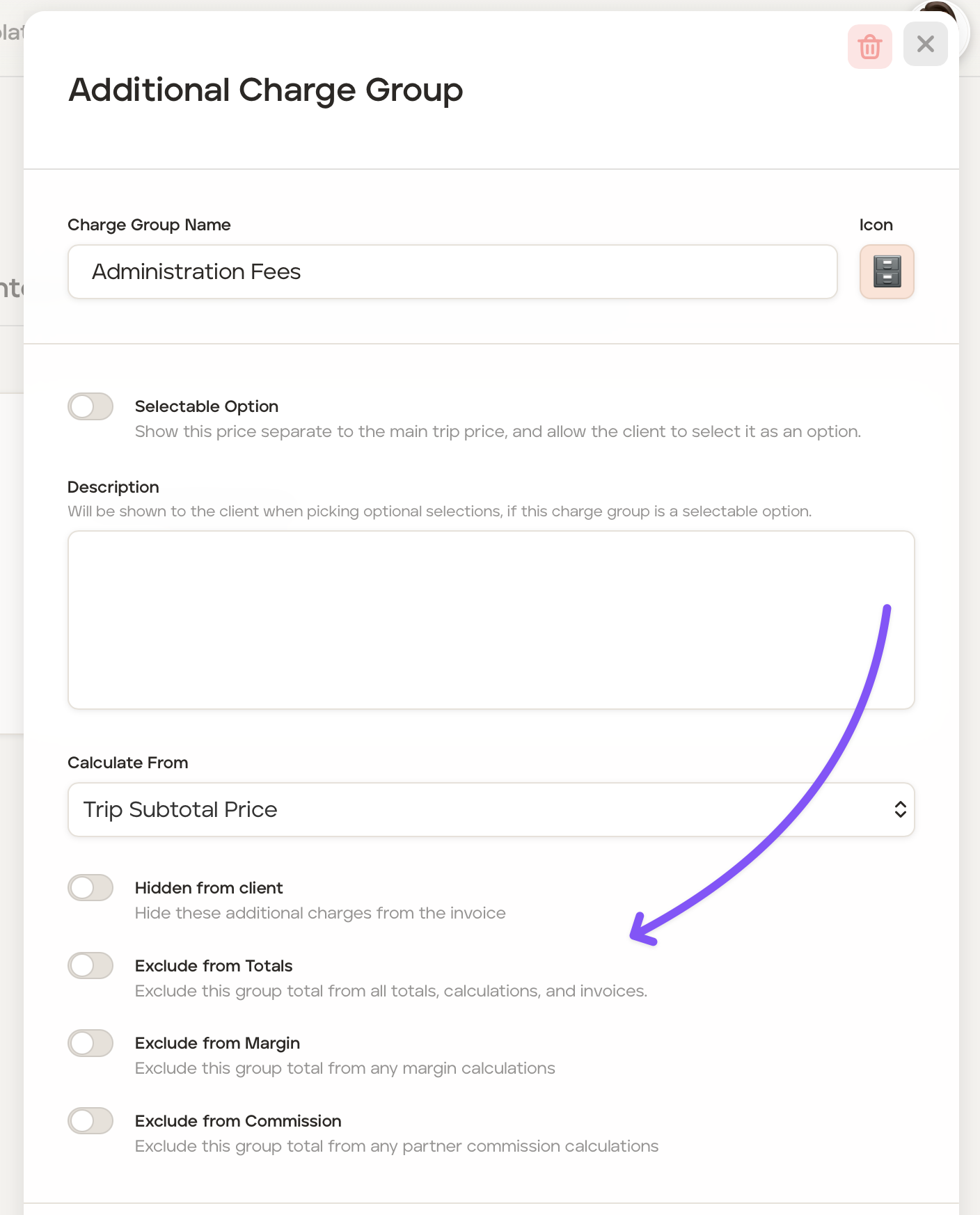 Exclude from Totals - Turn the toggle 'on' if you would like to exclude this total from all totals, calculations, and invoices.