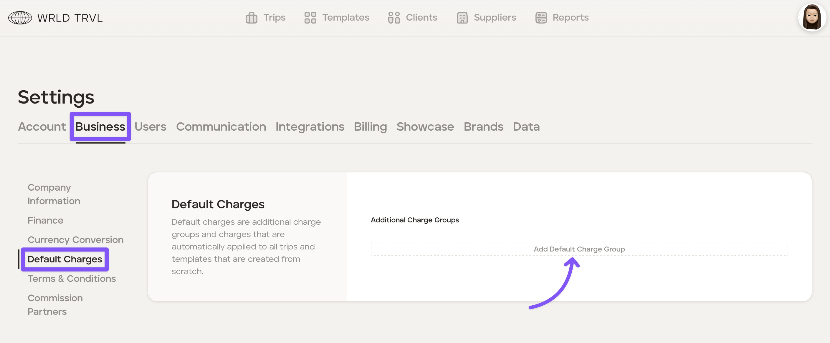In the 'Business' tab click 'Default Charges'.