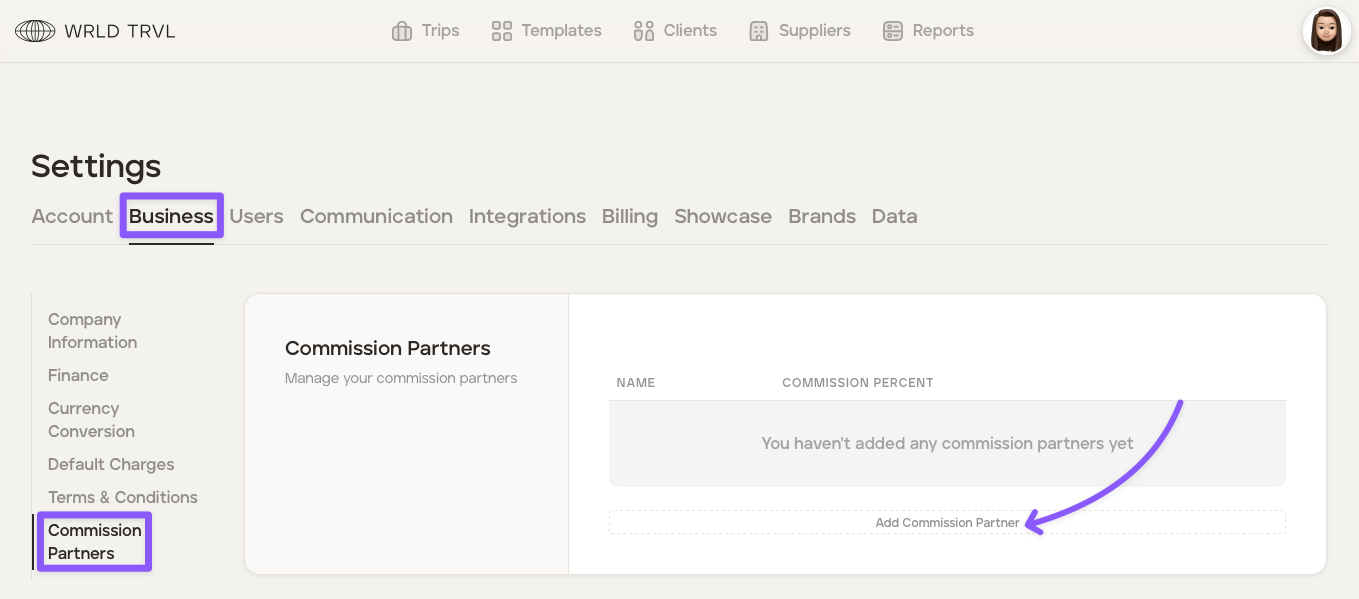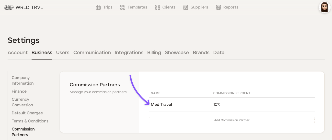 The TripMapper for Business Platform allows you to record your commission partners and the commission percentage.