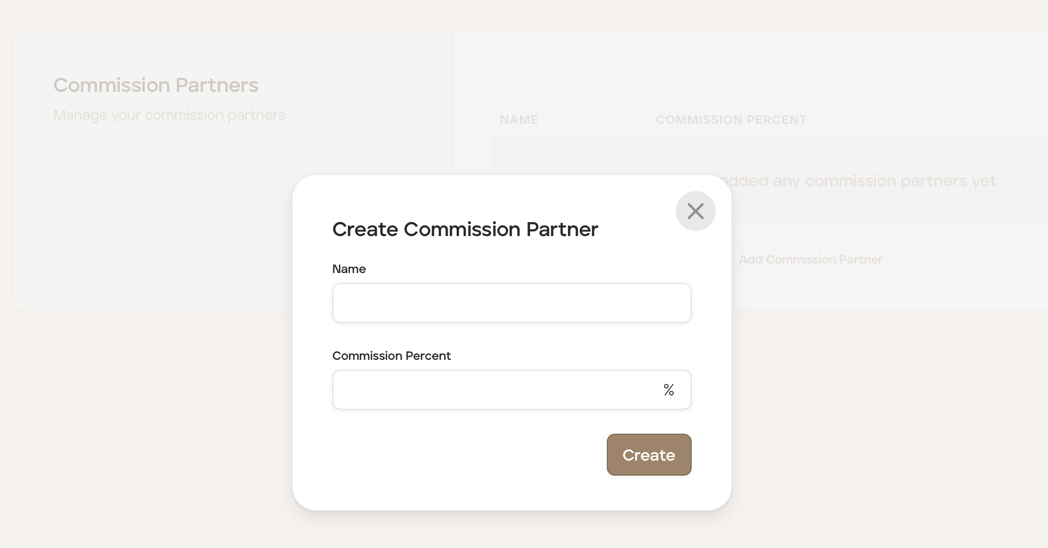 Add the commission partner name, commission percentage and then click the "Create" button.