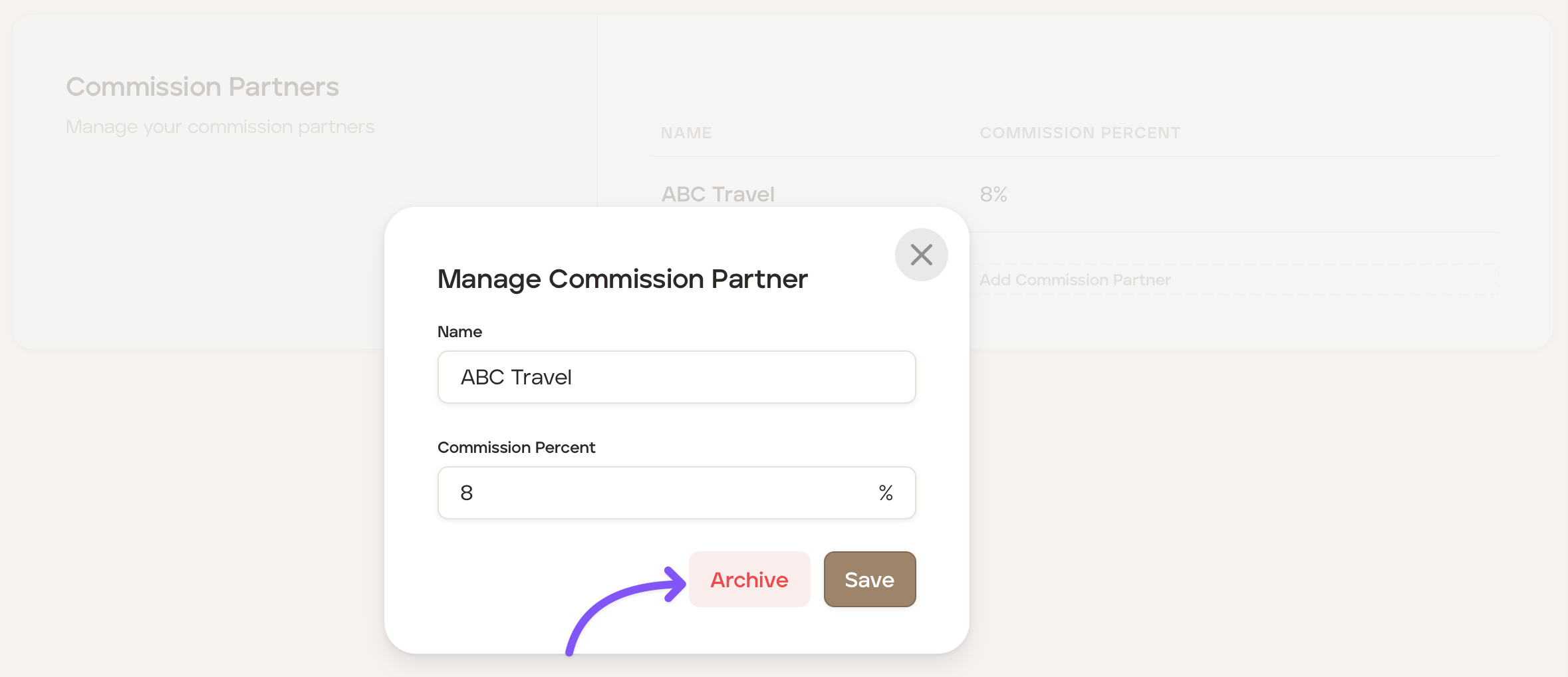 Click the "Archive" button to archive the commission partner.