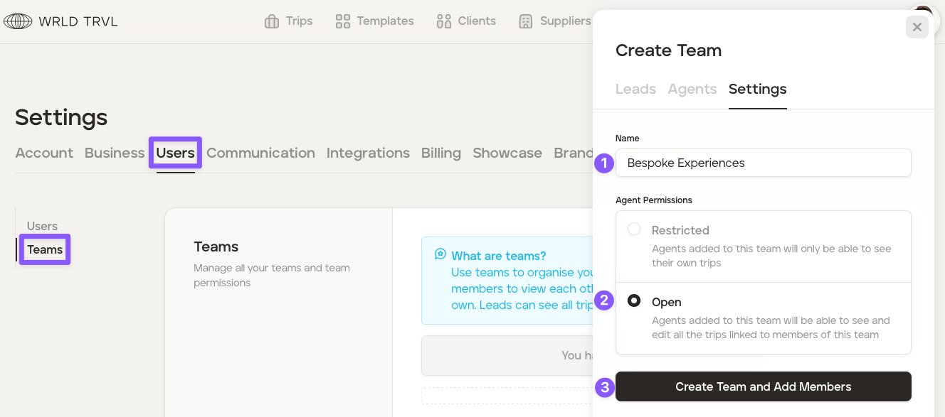 Open - Agents added to this team will be able to see and edit all the trips, cards, documents and blocks linked to members of this team.