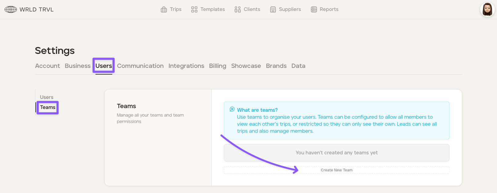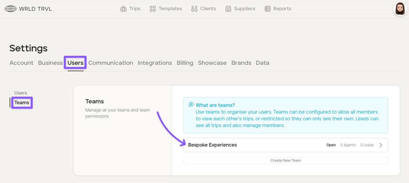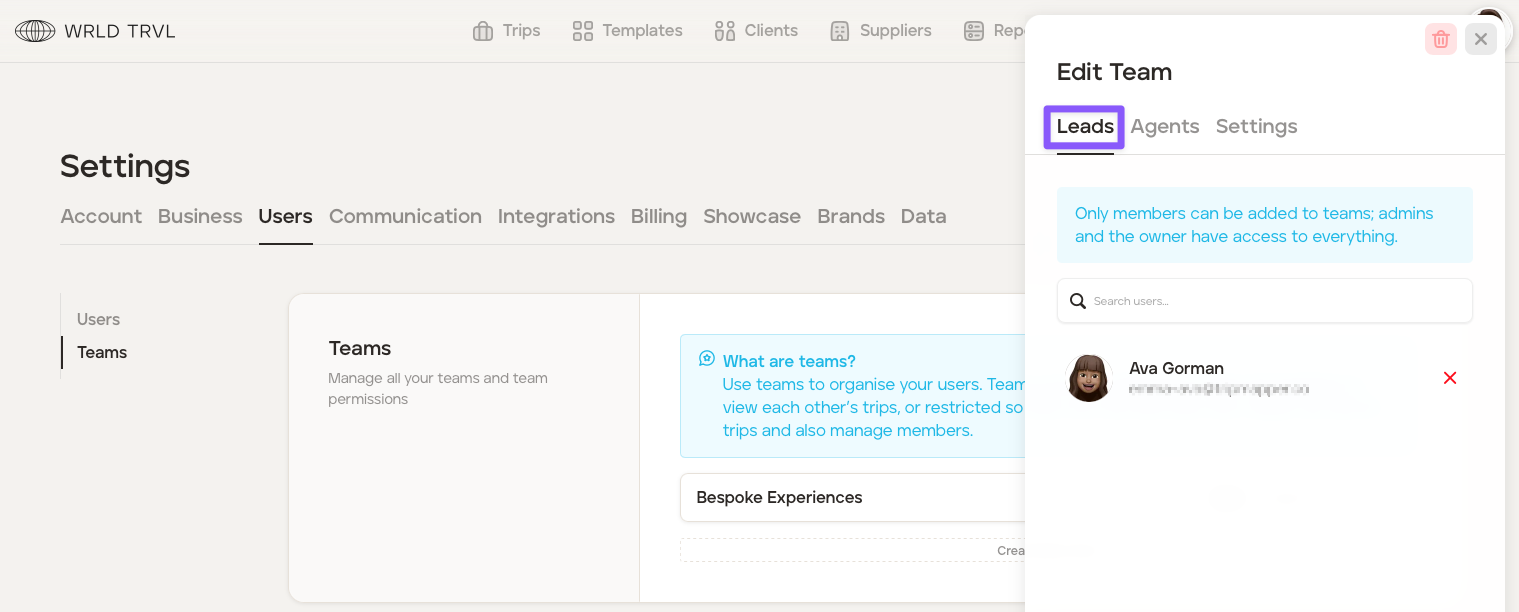 Teams can be configured to allow all 'Members' to view each other's trips, or restricted so they can only see their own trips. 'Leads' can see all trips and also manage 'Members'. If an itinerary or template card is not linked to a team(s), all users can view.