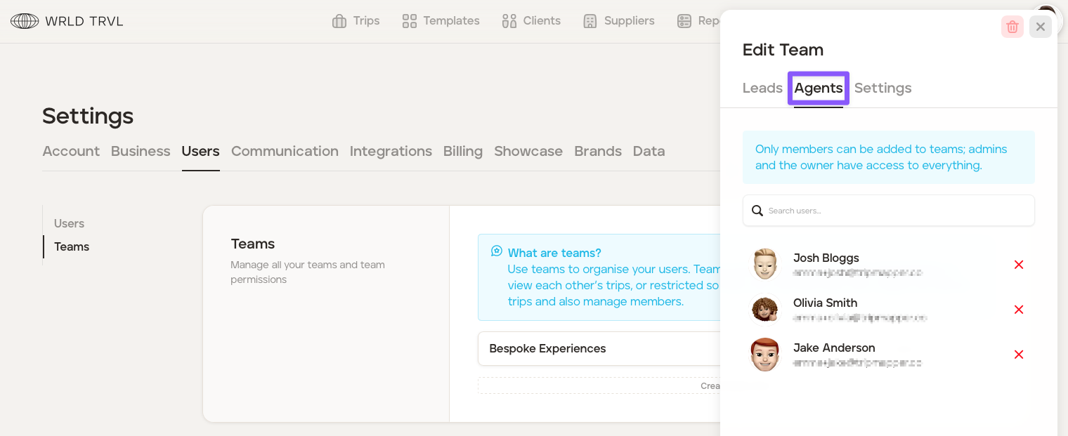 The 'Bespoke Experiences' team has 'Open' permissions. Therefore, the Agents (Josh, Olivia and Jake) will be able to see and edit all the trips, cards, documents and blocks associated with the 'Bespoke Experiences' team, plus any other trips, cards, documents and blocks on the account more generally which have not been allocated a team.