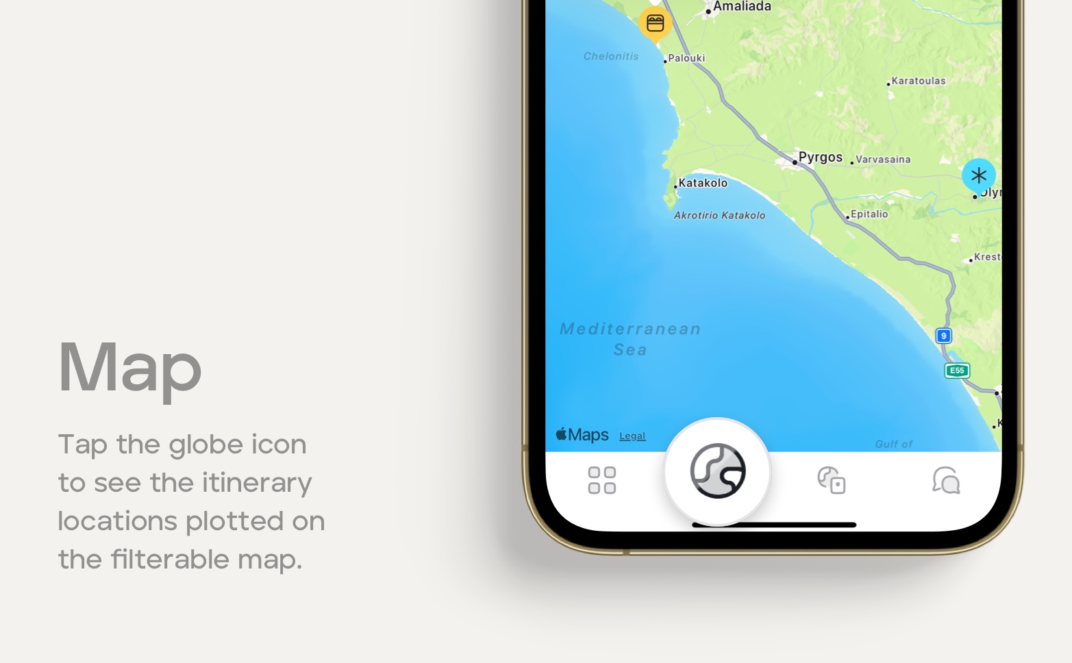 To view your itinerary locations, tap the globe icon. To filter the locations by day, tap the cog icon in the top right-hand corner of your screen and select the days you wish to view.