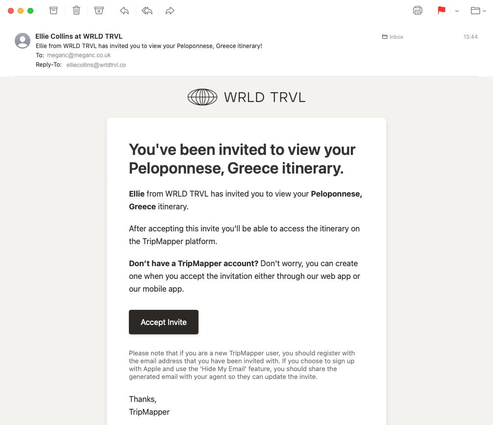 Open the email you've received from your travel adviser and tap on the “Accept Invite” button.