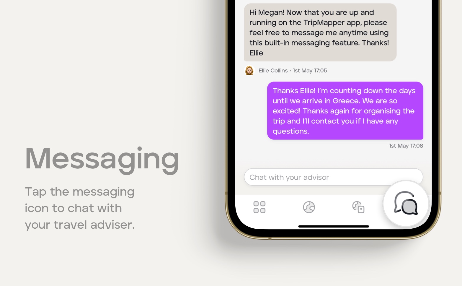 To stay in touch with your travel adviser tap the messaging icon, type your message and send!