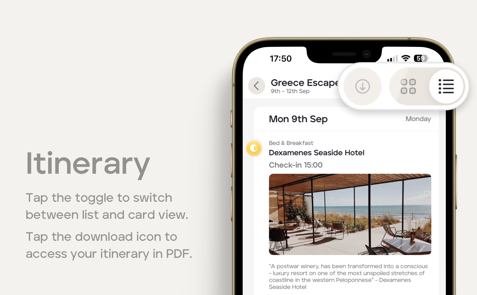 Tap the toggle in the top right-hand corner to switch between List View and Card View. In both views, you can tap each itinerary item for more information about that item and access any attachments/files (e.g., booking confirmations or tickets) your travel adviser may have added.