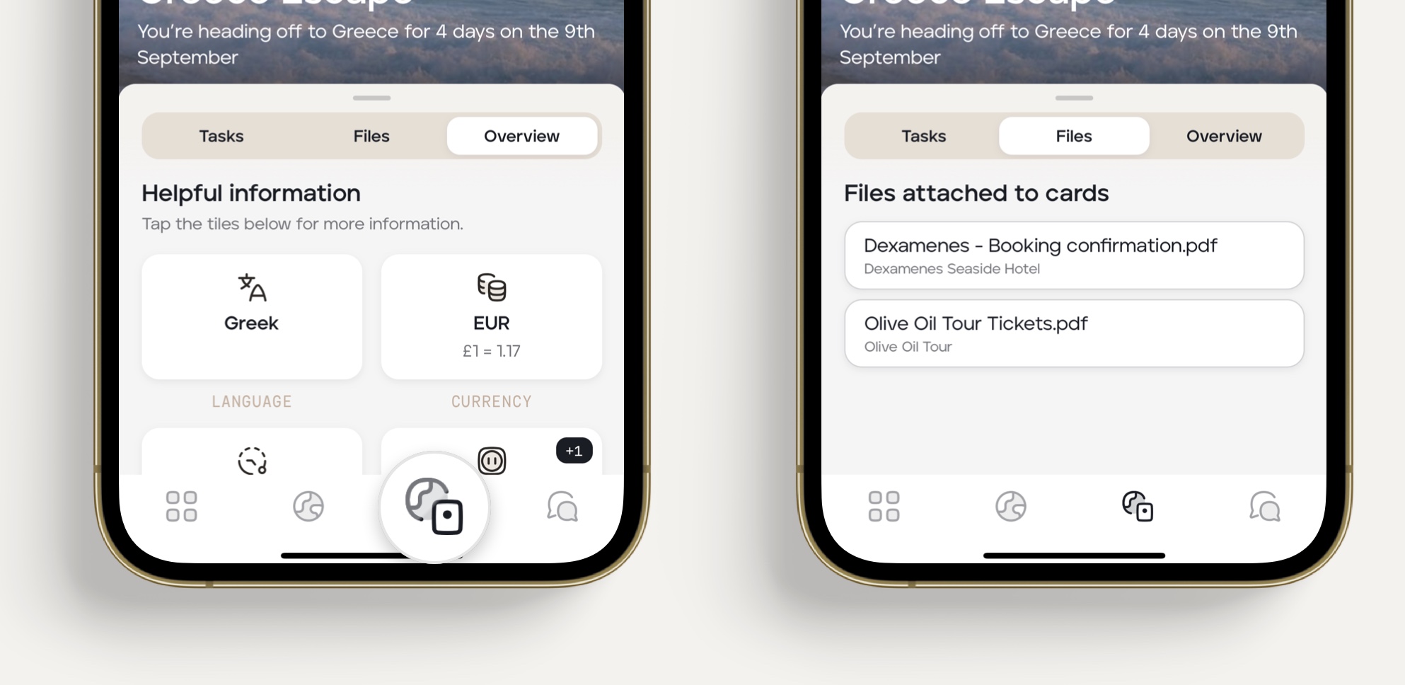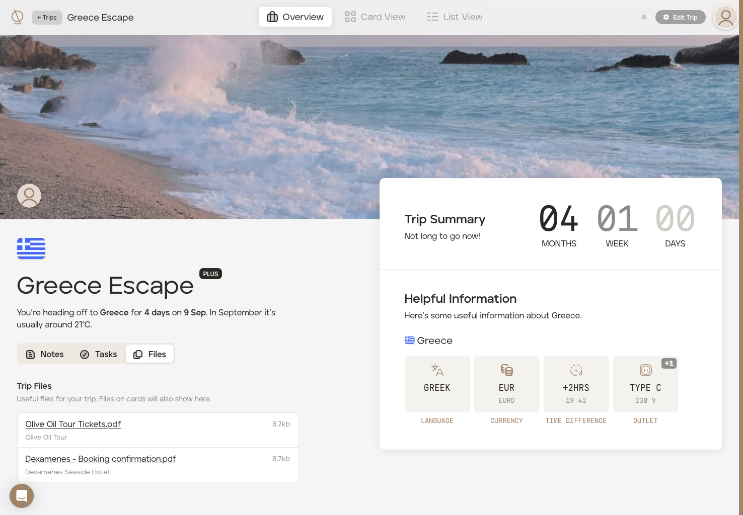 Tap the overview icon in the tab bar to see helpful information about your destination(s), access any files/attachments (e.g., booking confirmations or tickets) and view any tasks your travel advisor may have added for you.