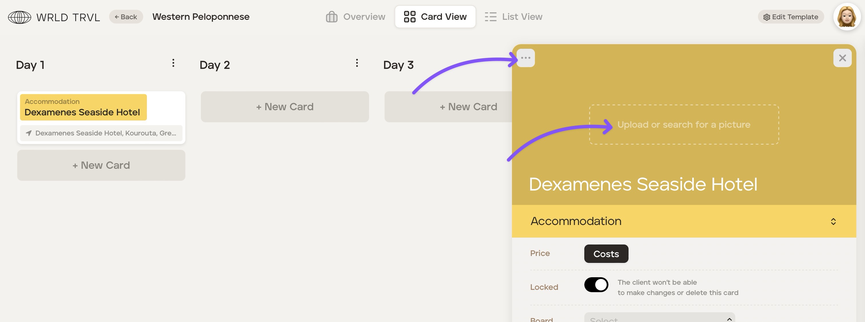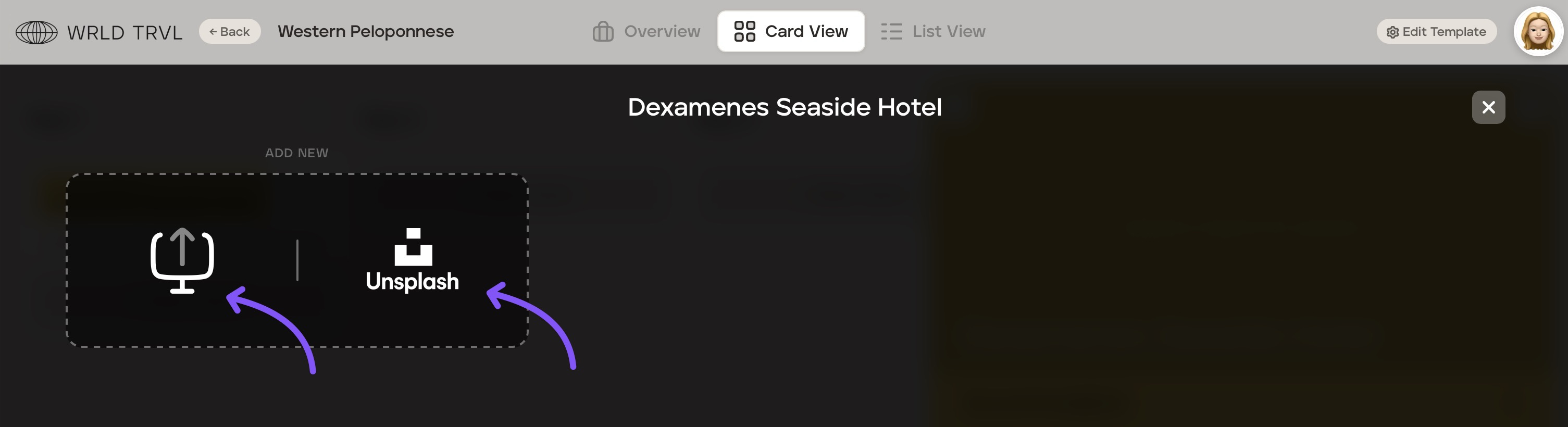you can select an image(s) from the Unsplash library by clicking the Unsplash icon and typing in the search box. Once you have found the Unsplash image you want, click it. Then click the ‘x’ button. You will now see the Unsplash image on your card.