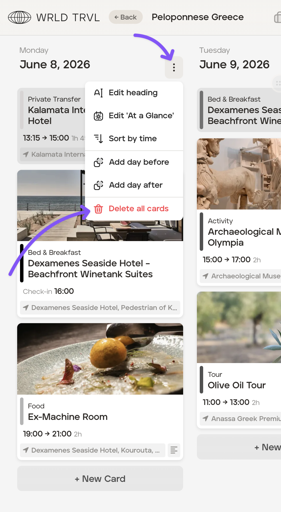 To delete all itinerary cards on one day of an itinerary, follow the steps below:
