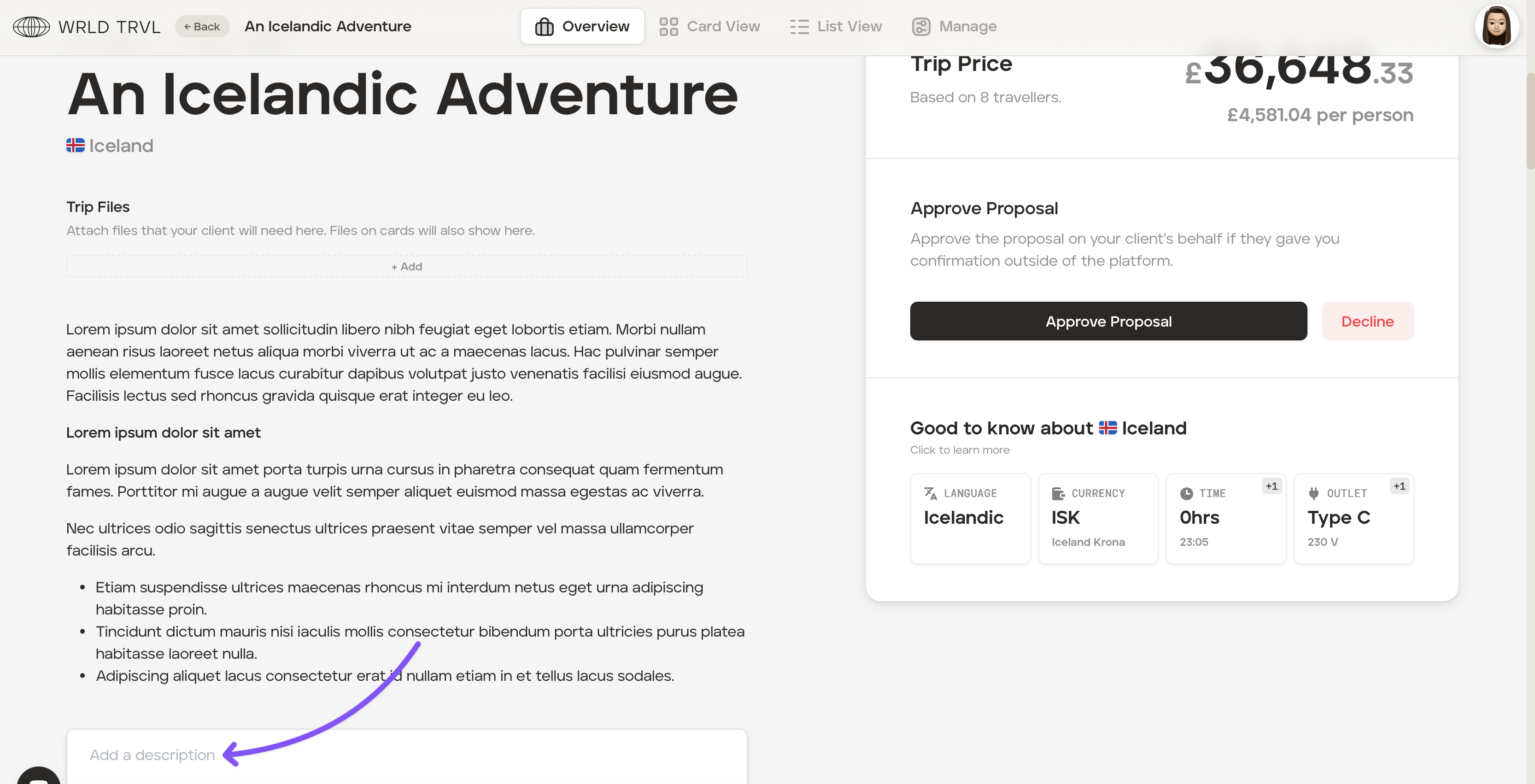 A child itinerary is an individual client booking within a fixed departure trip. Each child itinerary inherits its content from the master itinerary and has its own client, proposal, and payment management.