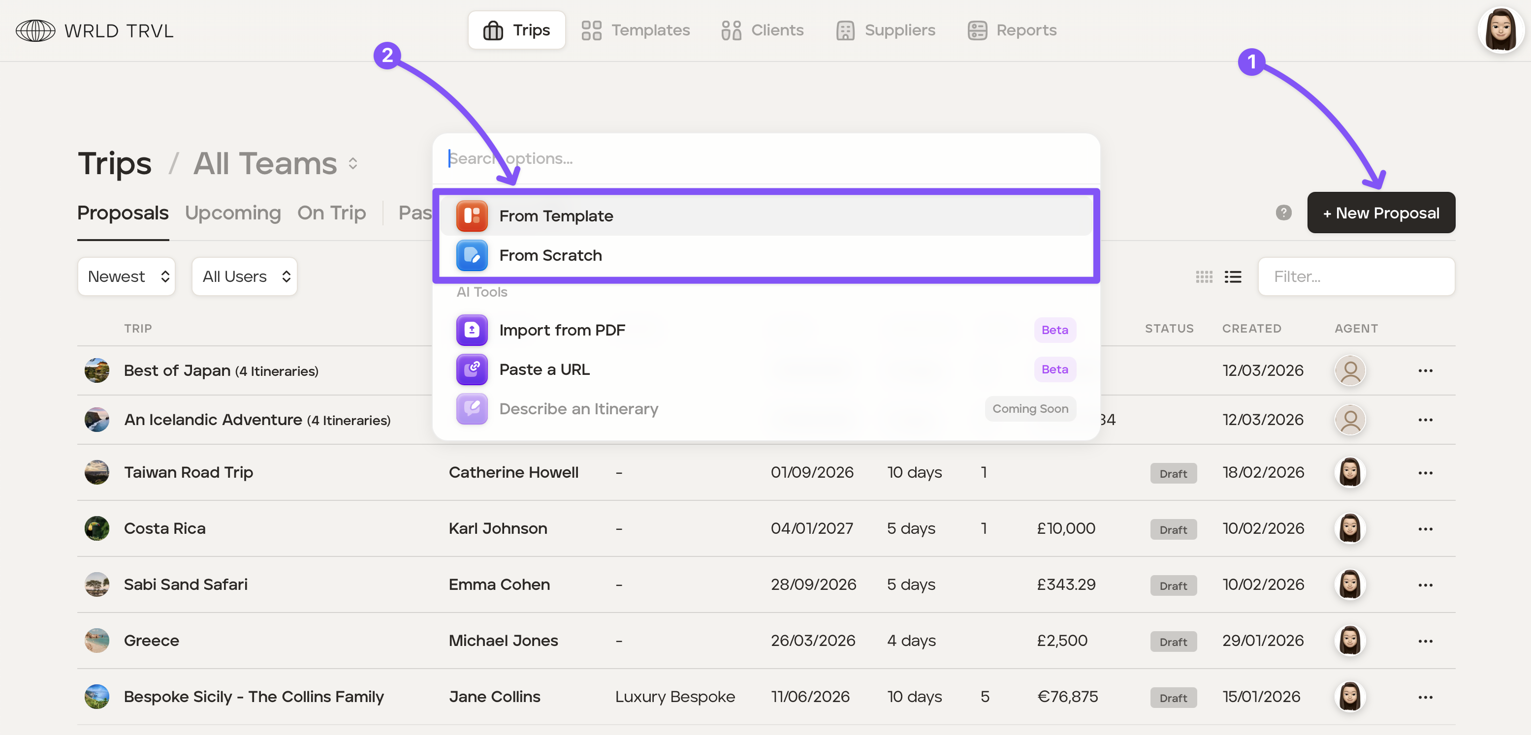 Go to the 'Trips' section and click '+ New Proposal'.