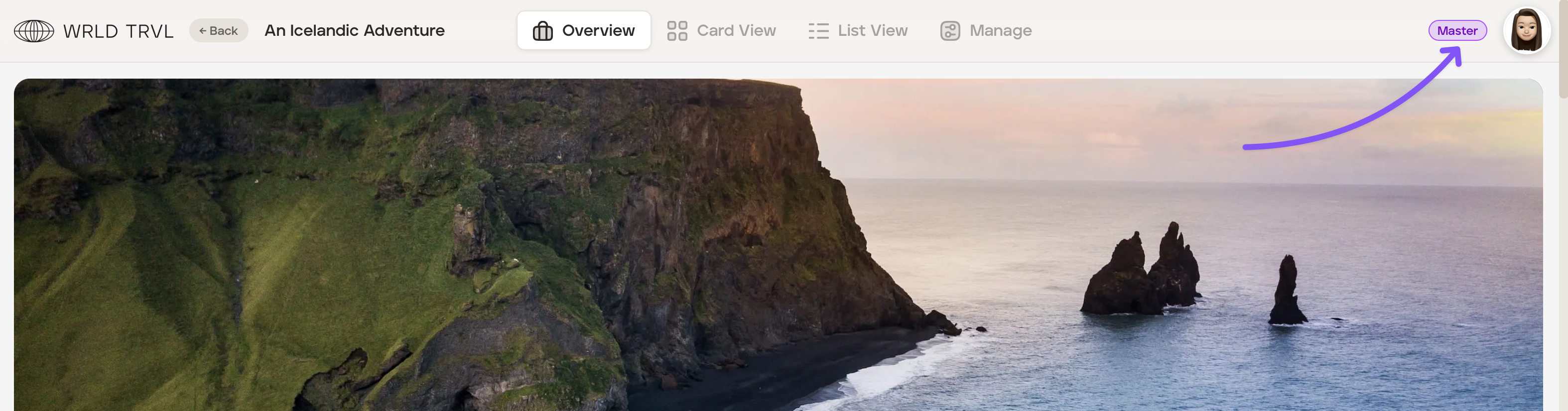 Once created, the master itinerary is identified by a 'Master' tag in the top right corner of the screen.