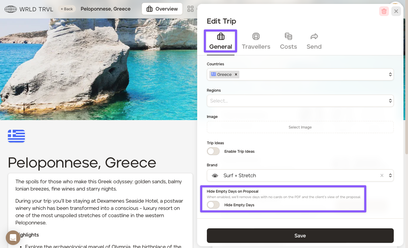 Please note, enabling the 'Hide Empty Days' switch, will only hide days on the proposal card view, proposal list view, and the PDF, not hide empty days on the mobile and web app.