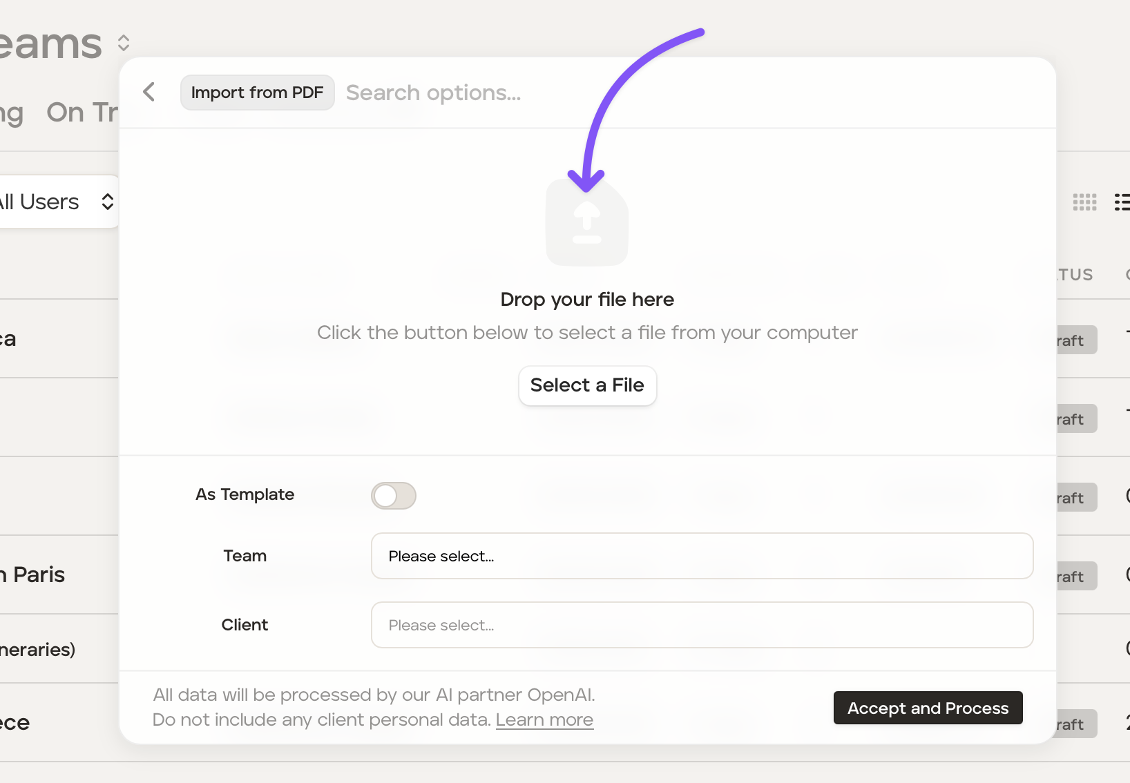 Select the applicable team (optional) if creating a template from the PDF, or select the applicable team (optional) and client (mandatory) if creating a proposal from the PDF.