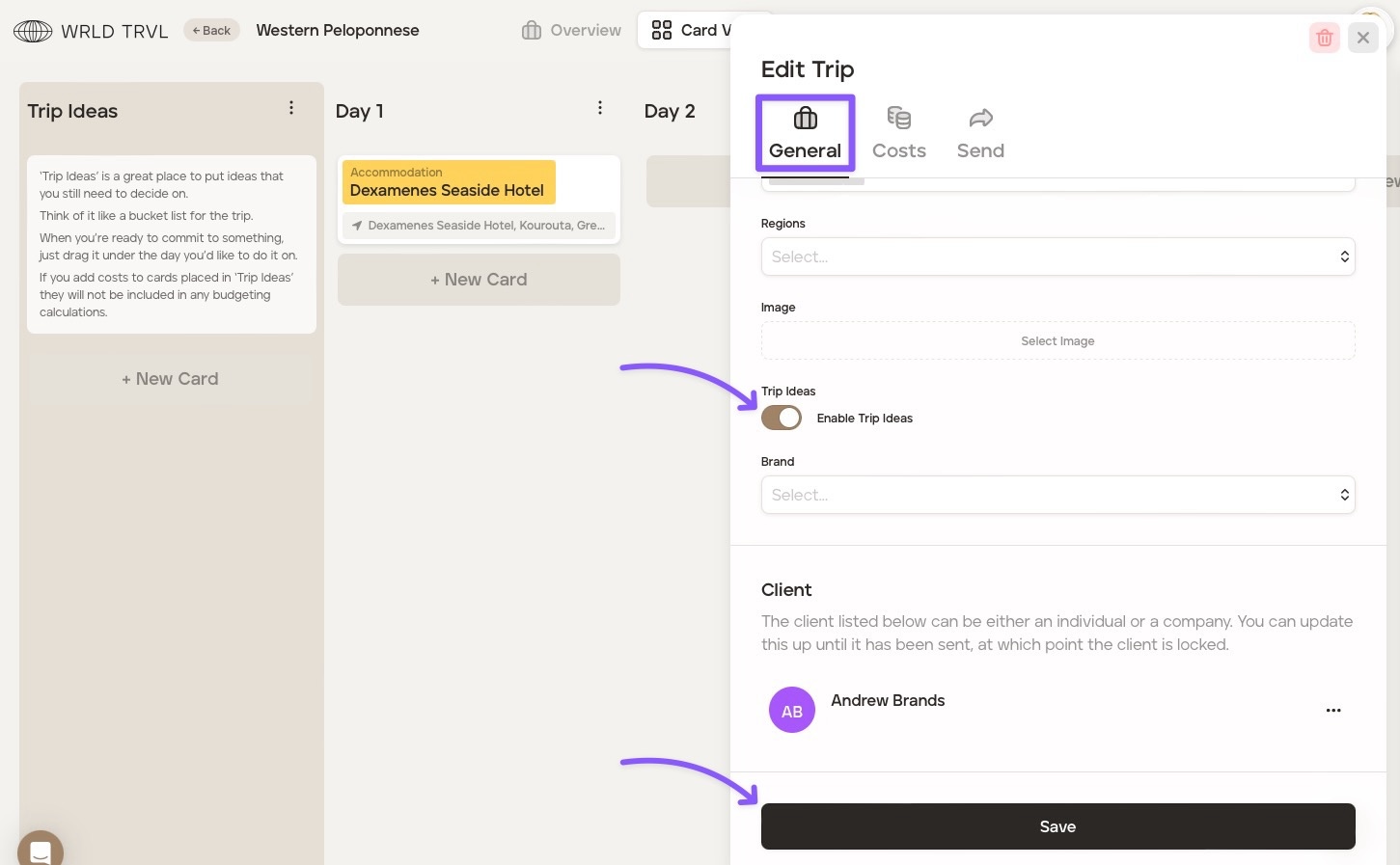If you have some itinerary ideas which you do not want to place within the proposal itself, you can follow the same process of adding cards in the ‘Trip Ideas’ column on the left-hand side of the screen.