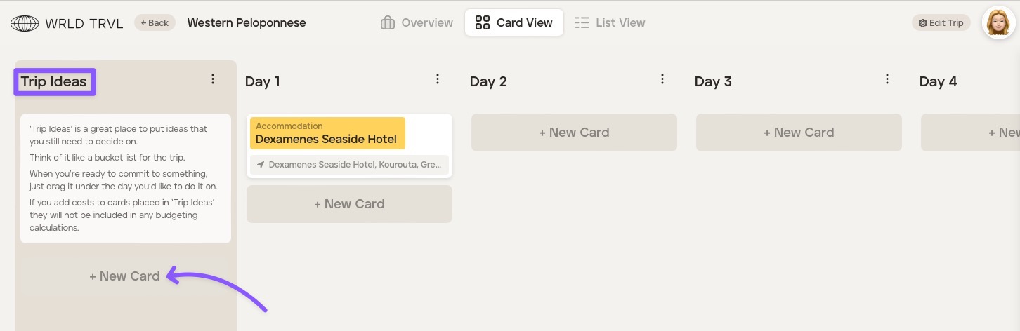 Trip ideas column on card view