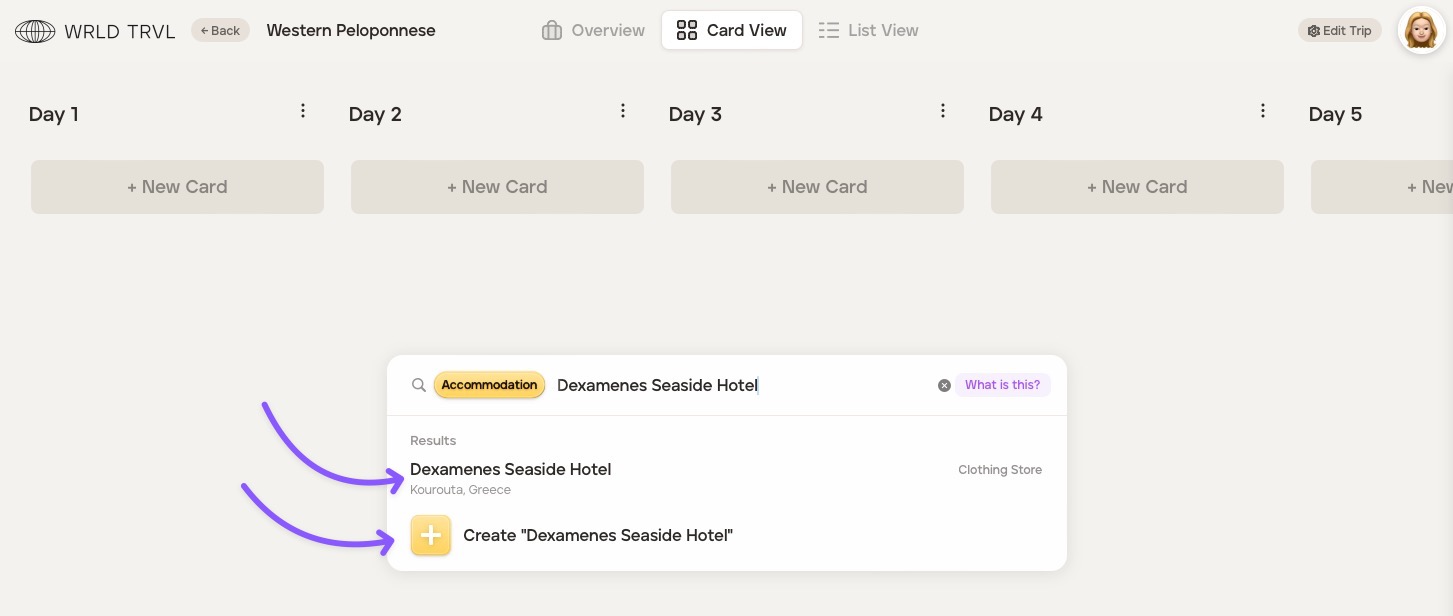 Add any additional information you wish to the card. Fill in as much, or as little, information as you wish on the card. Scroll down the card to reveal all the fields which are slightly different depending on the card type ('Accommodation', 'Activity', 'Travel', 'Food' or 'Other').