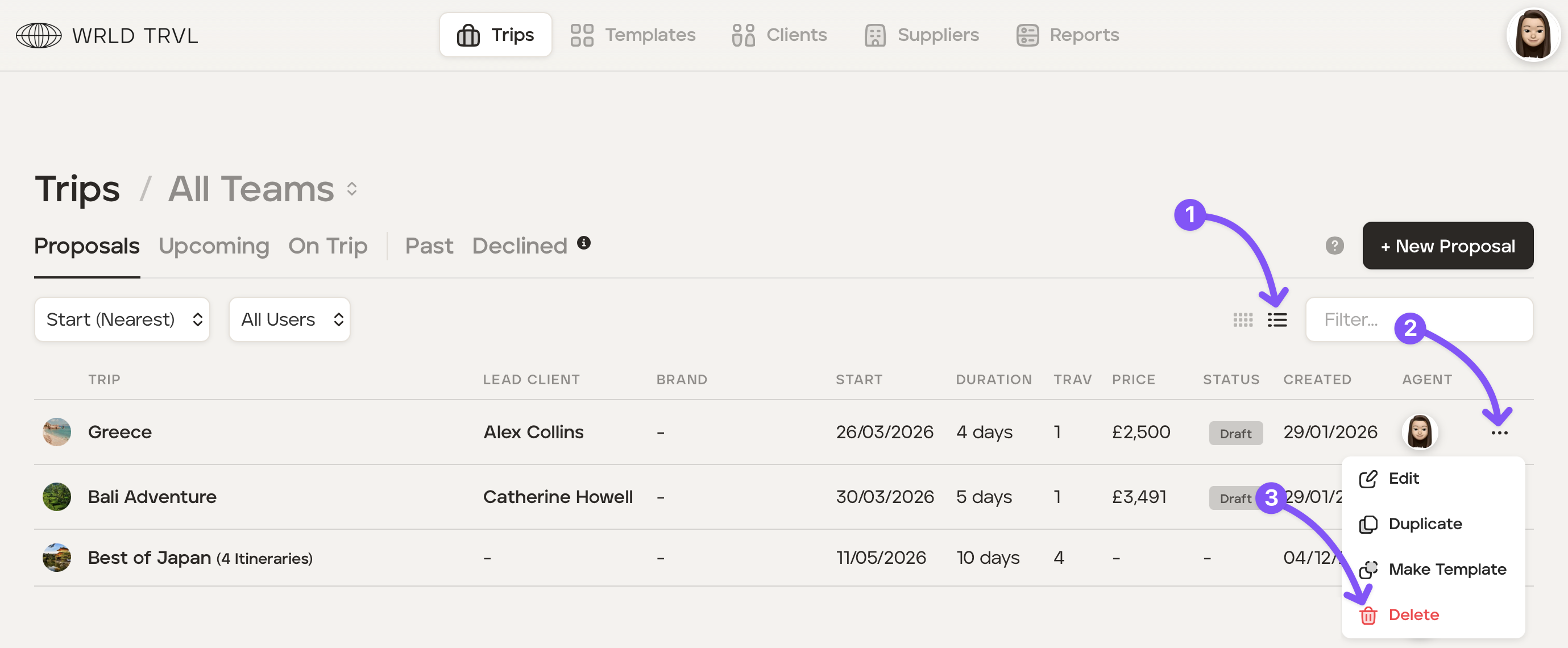 Click the list view icon and then the three dots next to the proposal you wish to delete.