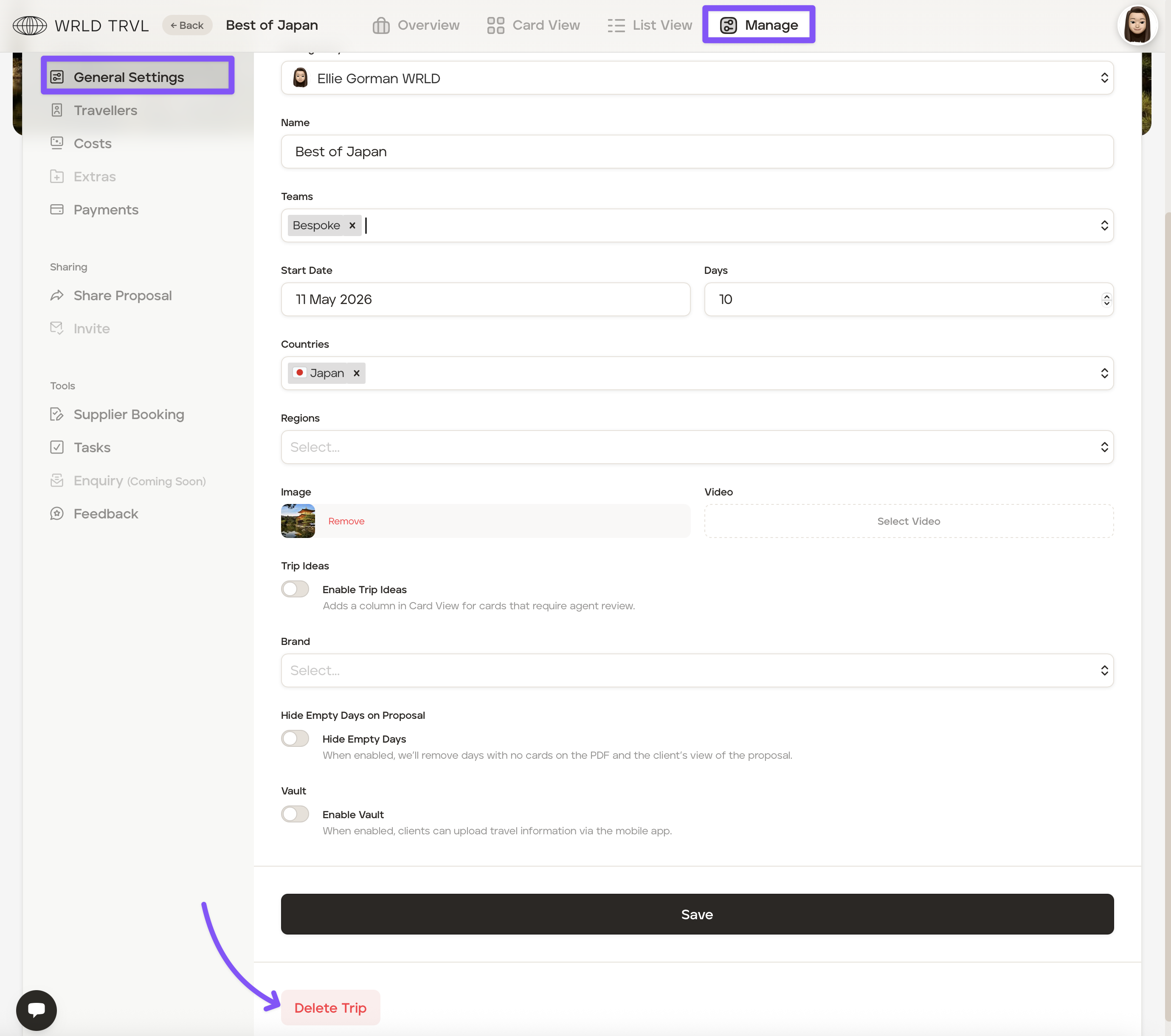 In the 'General Settings' tab, scroll down and click the red 'Delete Trip' button.