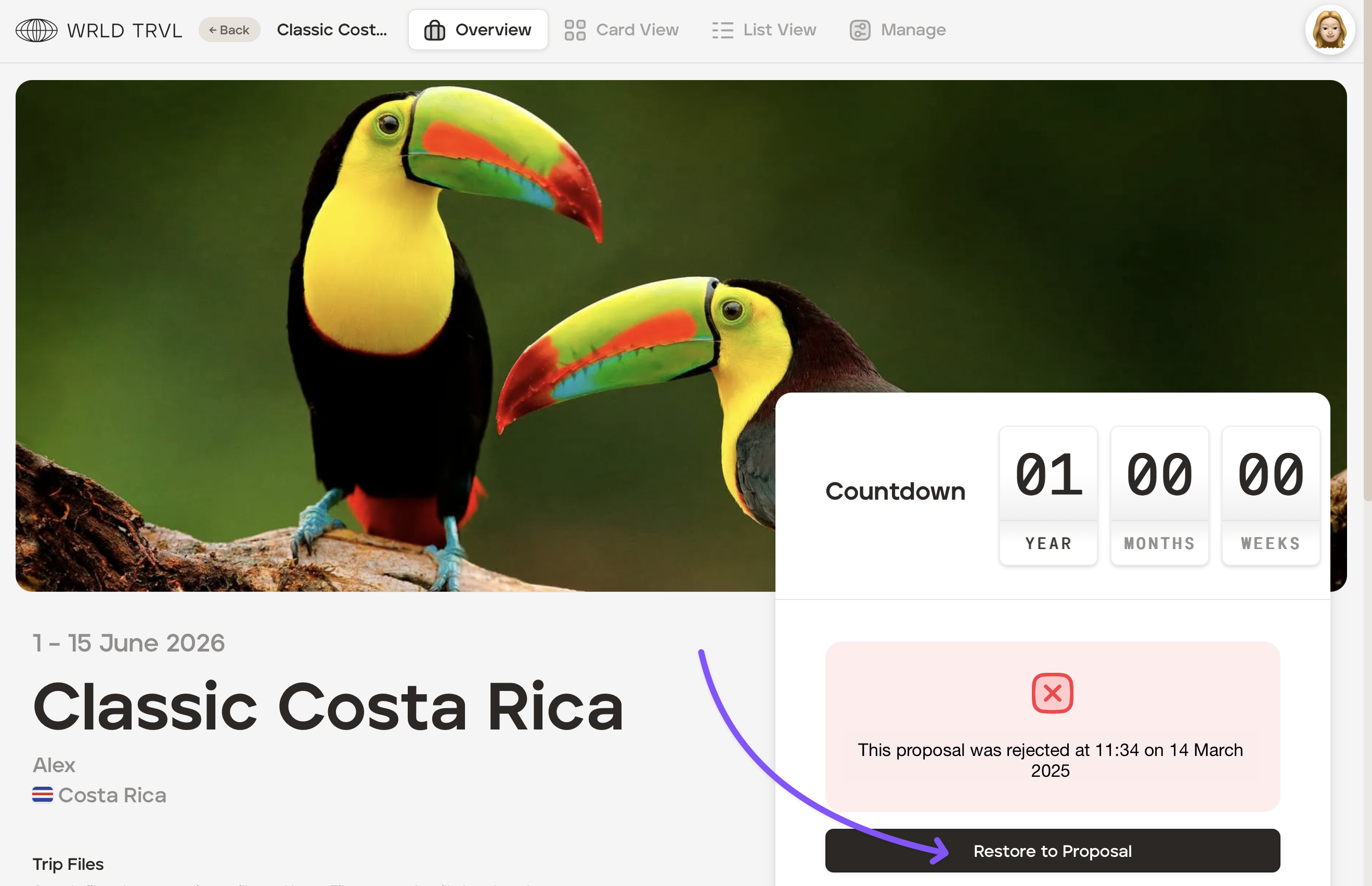 On the 'Overview' screen click the 'Restore to Proposal' button.