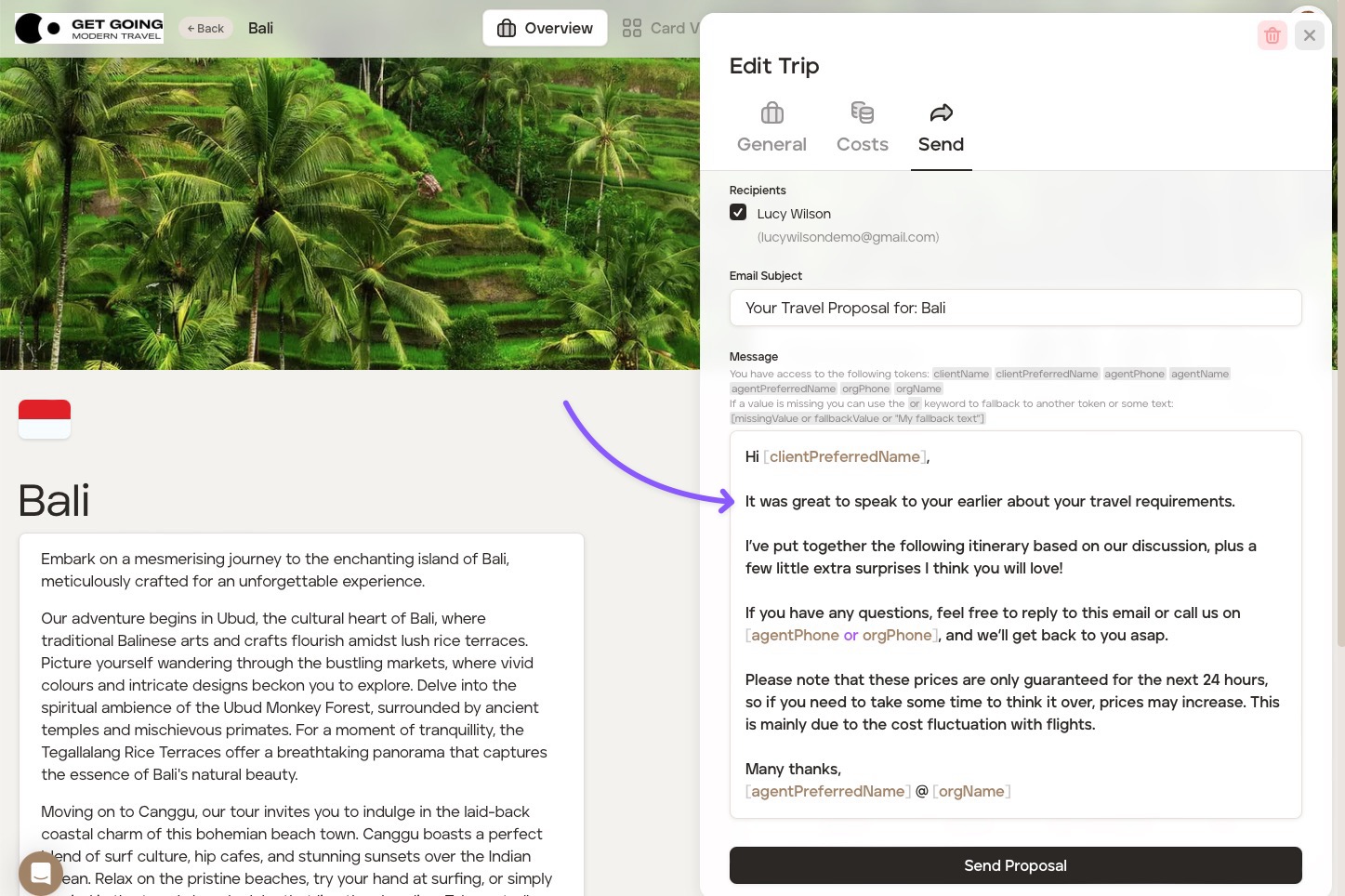 When you're ready to send a proposal to your client, the default email you've set in the platform 'Settings' will show, but you are still able to make changes to the email prior to sending to the client if you wish to do so (which will not affect the default email in 'Settings'):