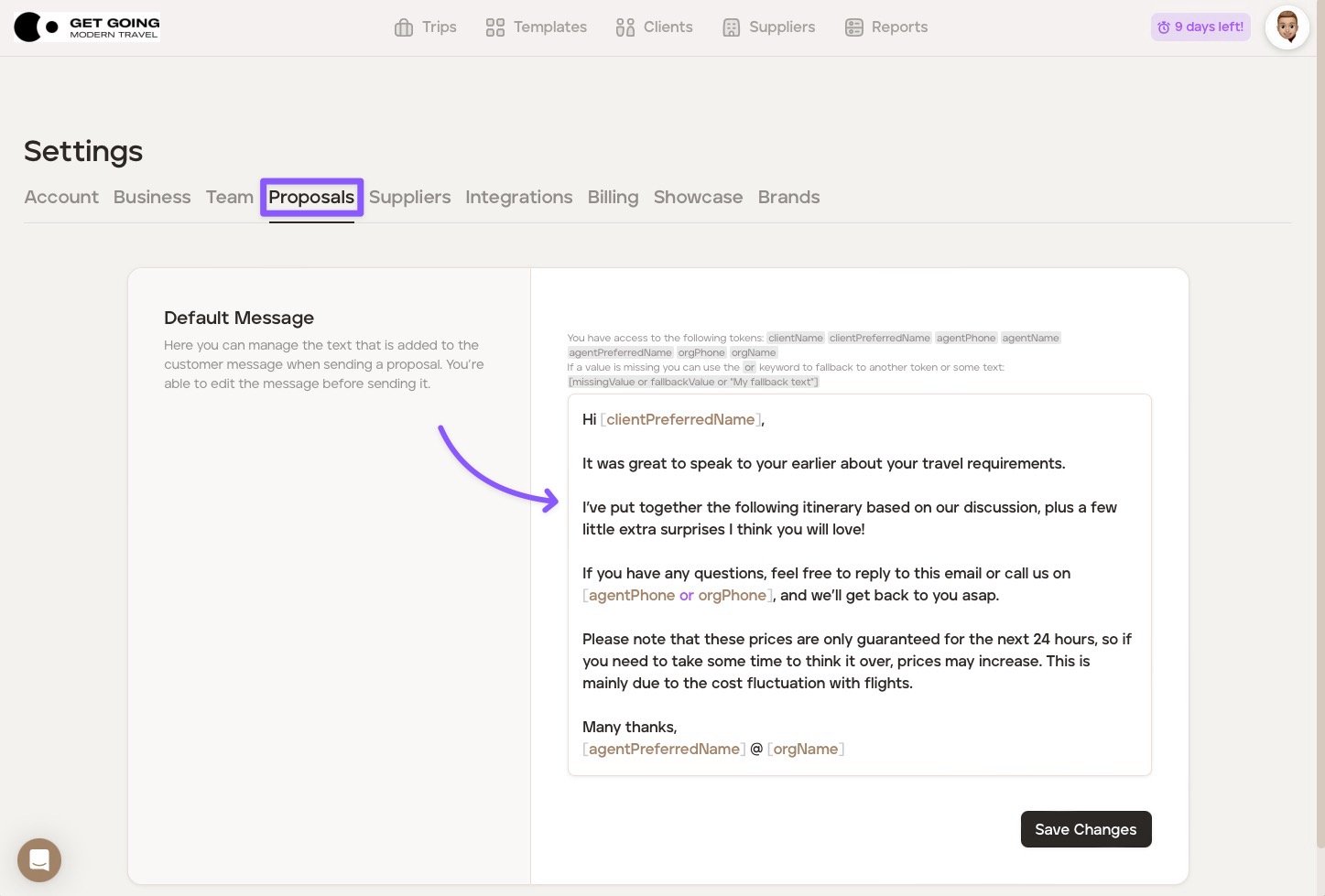 You can set default text that is added to your email when sending a proposal to a client. You are still able to edit the default text before sending it to your client. To set your default text, follow the steps below: