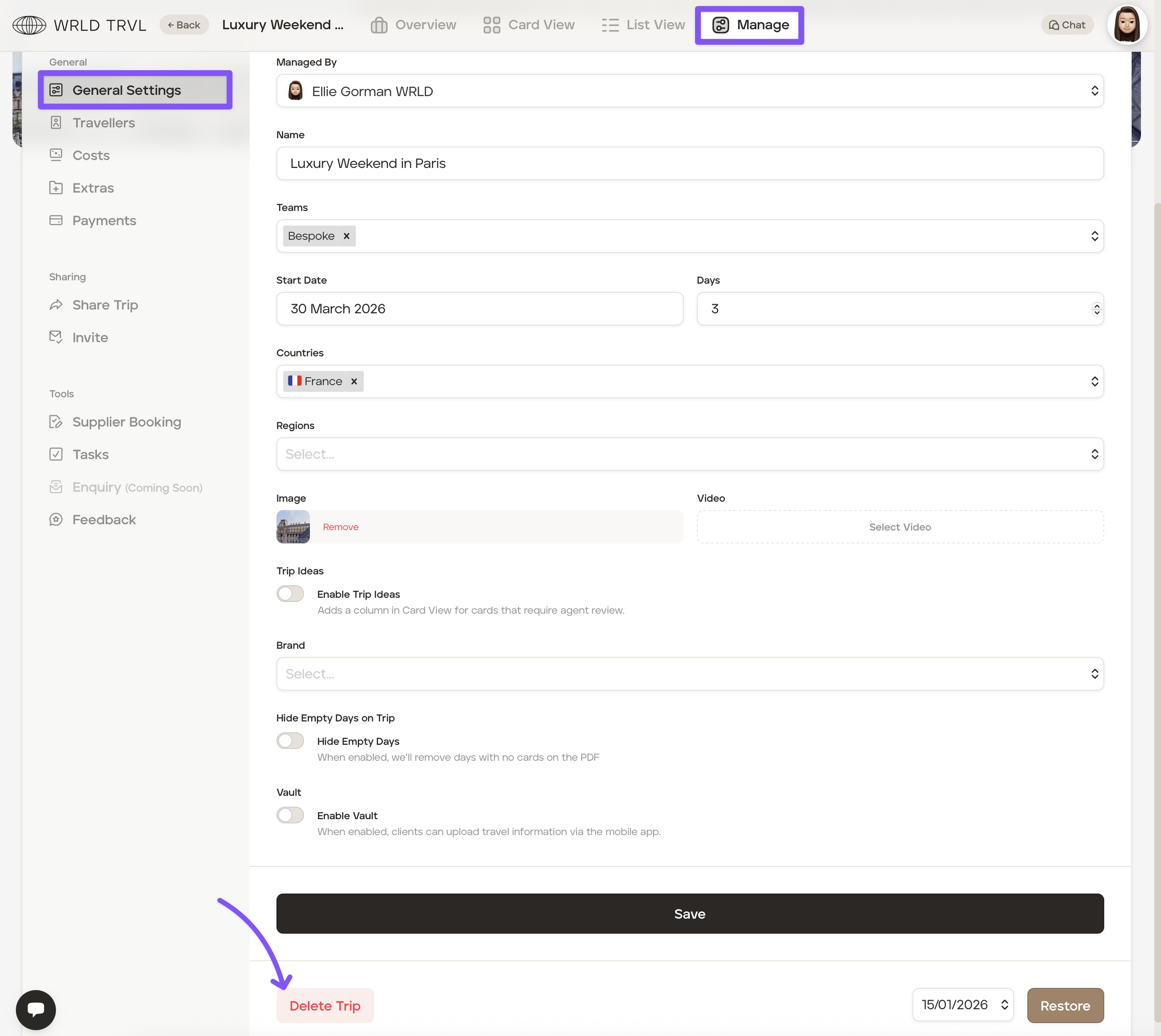 In the 'General Settings' tab, scroll down and click the red 'Delete Trip' button.