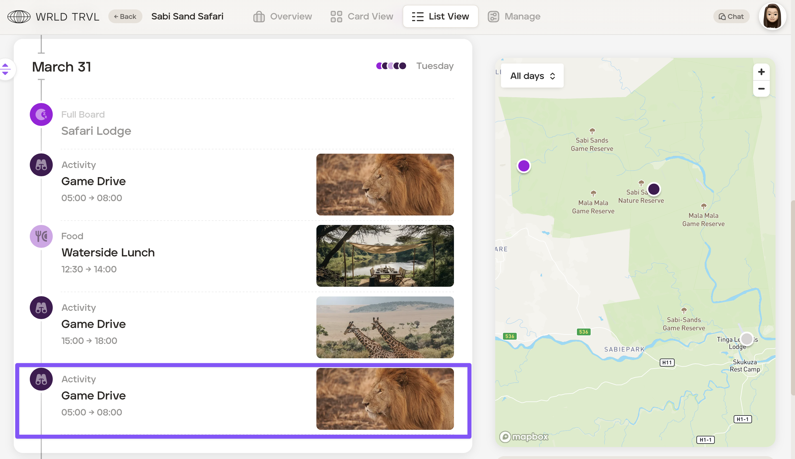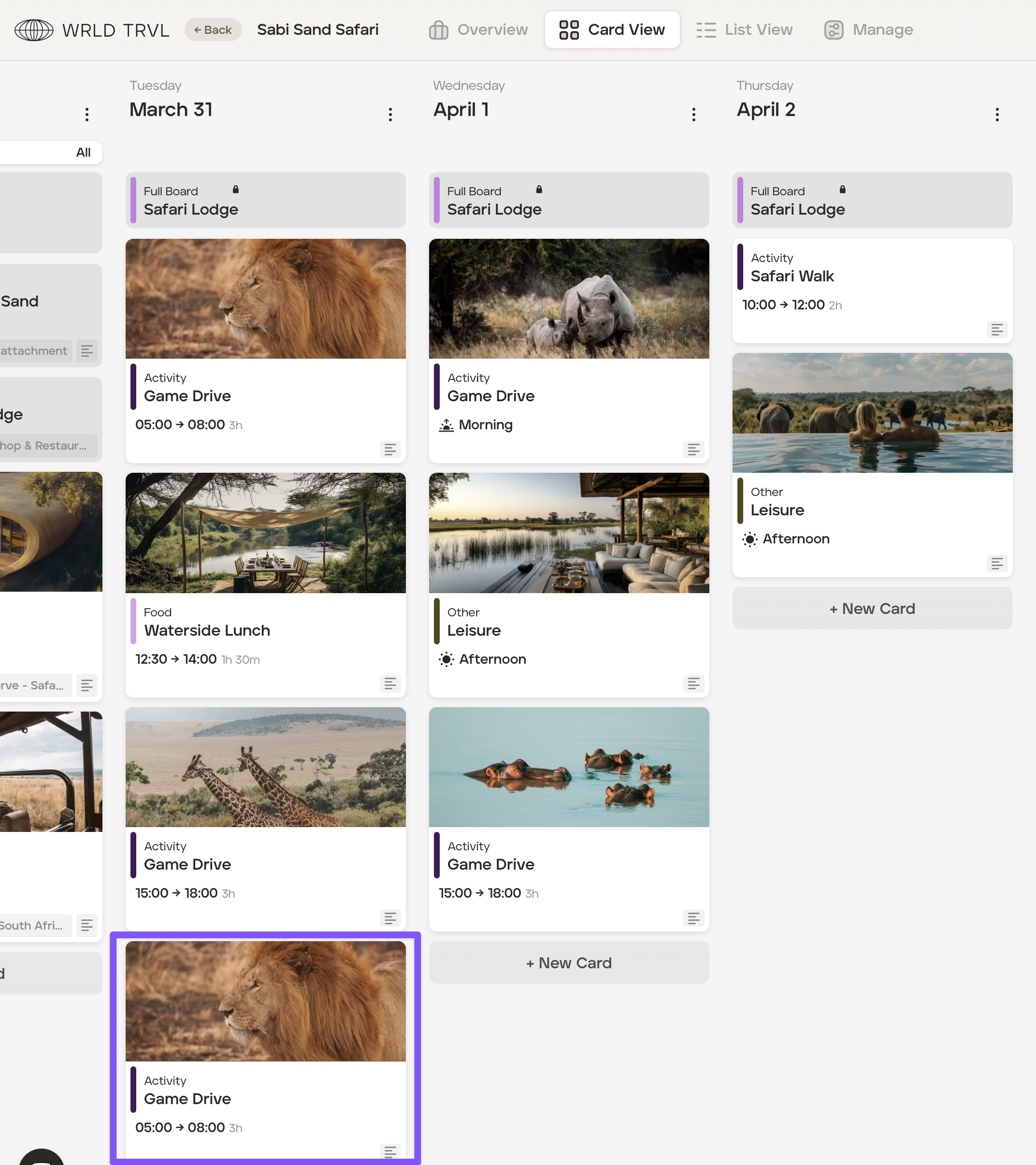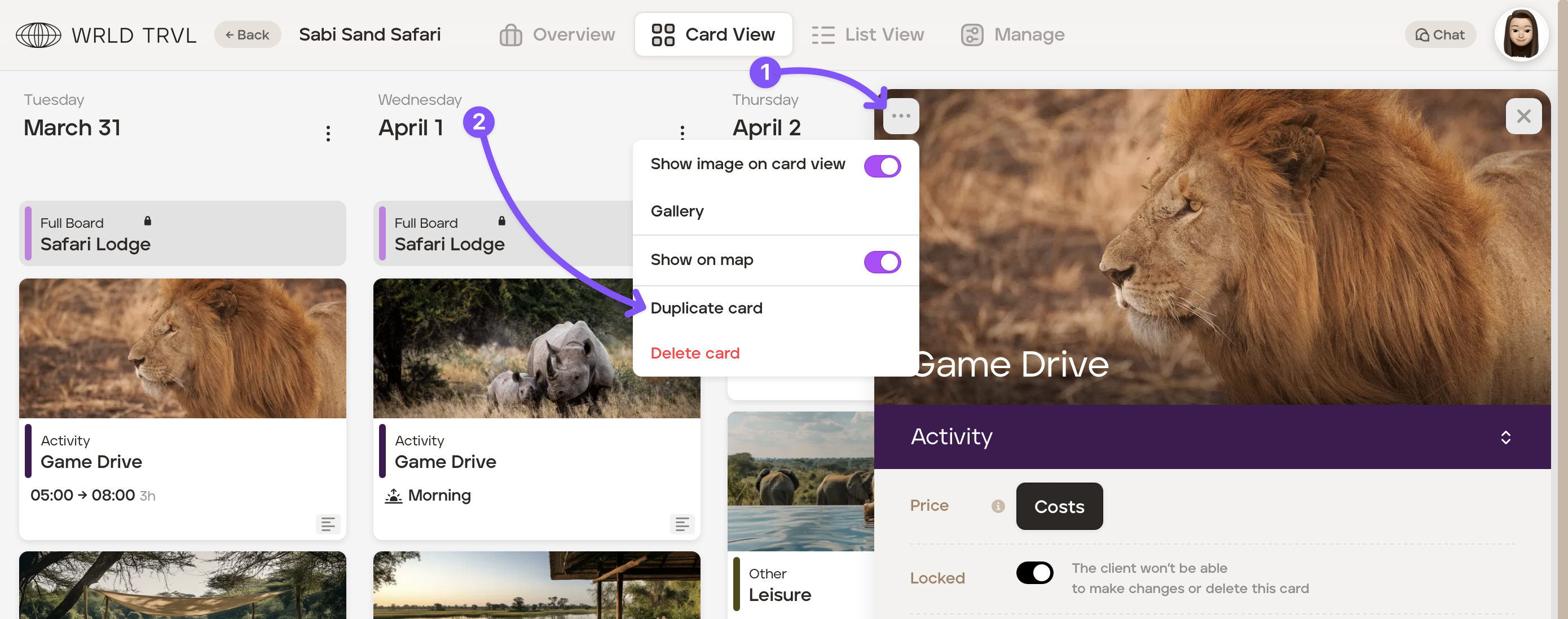 To duplicate a card in a template, proposal or upcoming trip, follow the steps below: