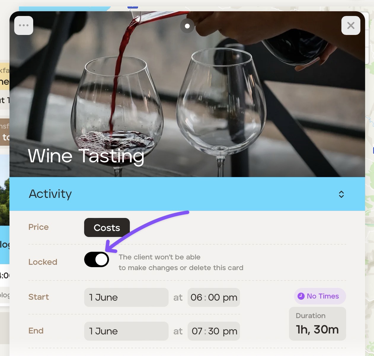 Itinerary cards are all locked by default. This means if you give your client 'Editor' permission when inviting them to view an upcoming itinerary, they will not be able to edit or delete any of your itinerary cards unless you have specifically allowed them to by 'unlocking' the card.