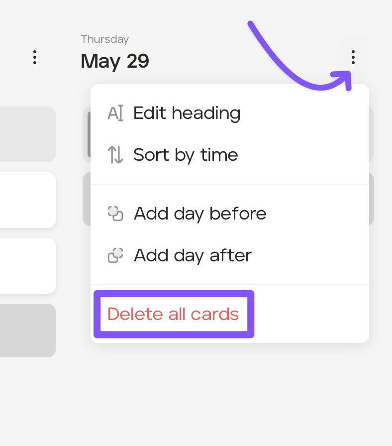 Delete any other cards on those final days when the guest will not be on the trip. You can do that by deleting each card individually, or do it quickly by clicking the three dots on the applicable day on 'Card View' and clicking ‘Delete all cards.’