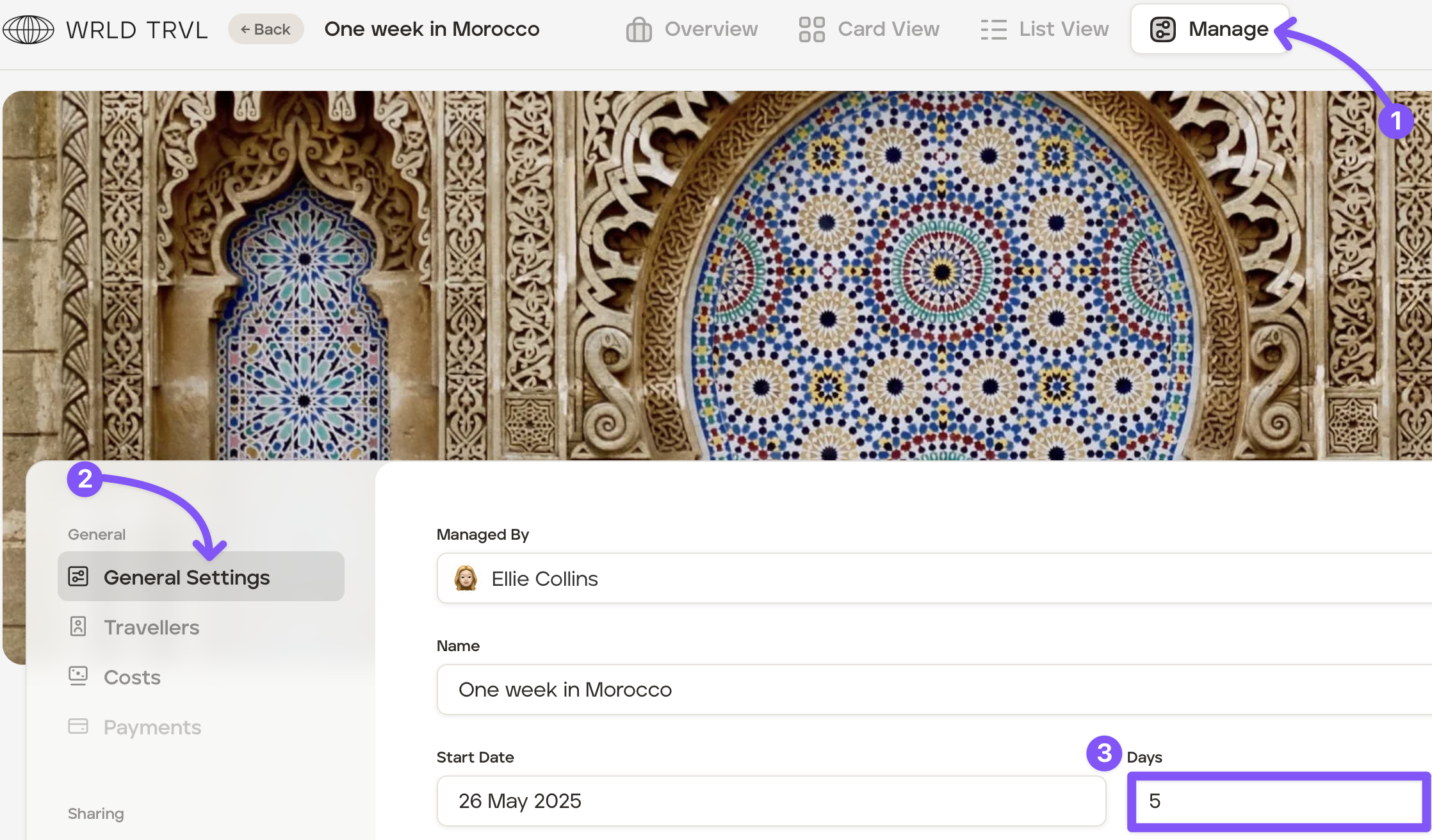 In the ‘General Settings’ tab, go to the ‘Days’ field and reduce the number of days of the trip to the correct number of days for the guest. For example, if it currently says 5 days in the ‘Days’ field and the trip is now only 4 days, you would change this from 5 days to 4 days. This will remove the 5th day from the itinerary.