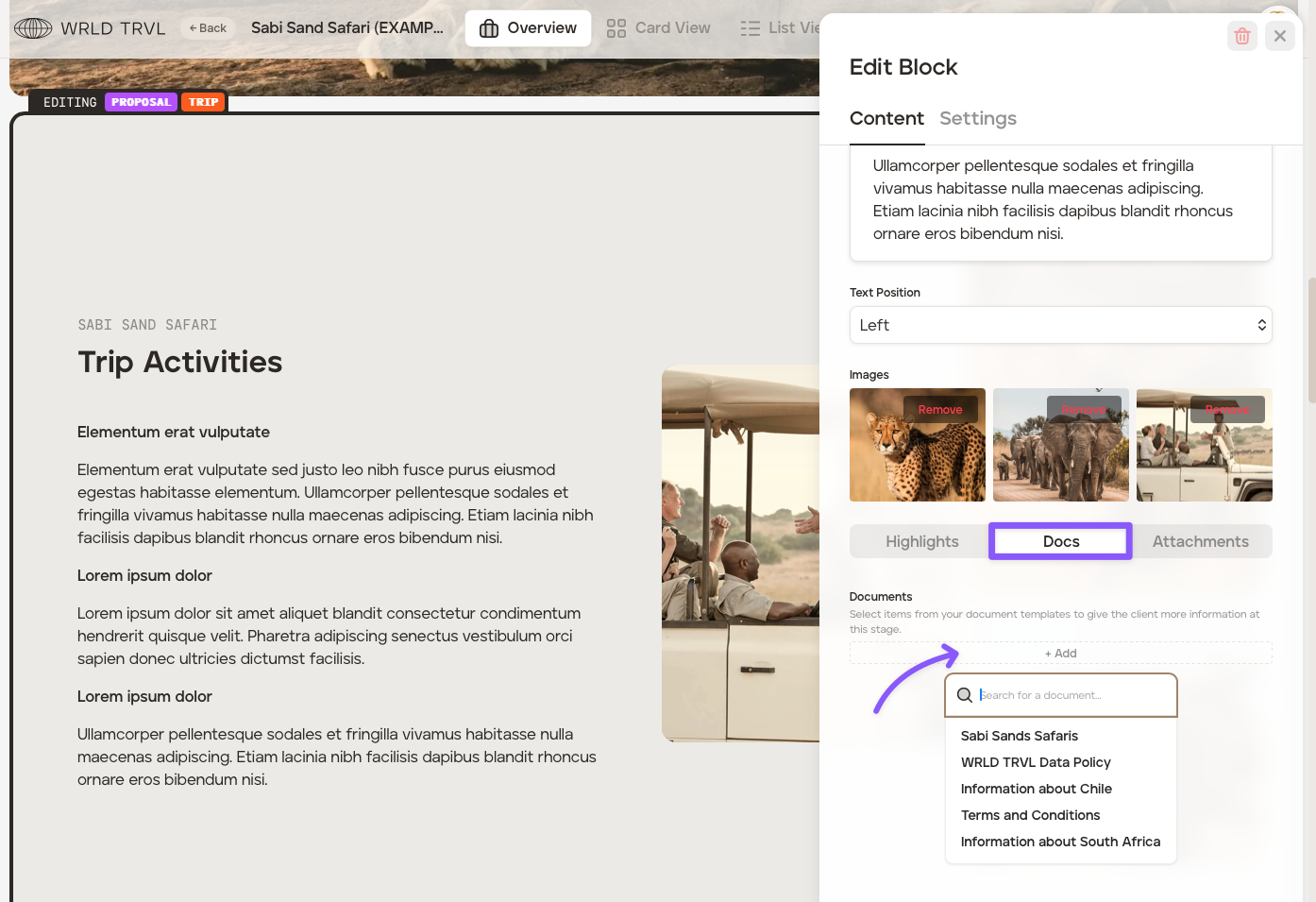 Once shared with your client, either as a proposal or when viewed as an itinerary on the app, your client will simply click the document to reveal the text.