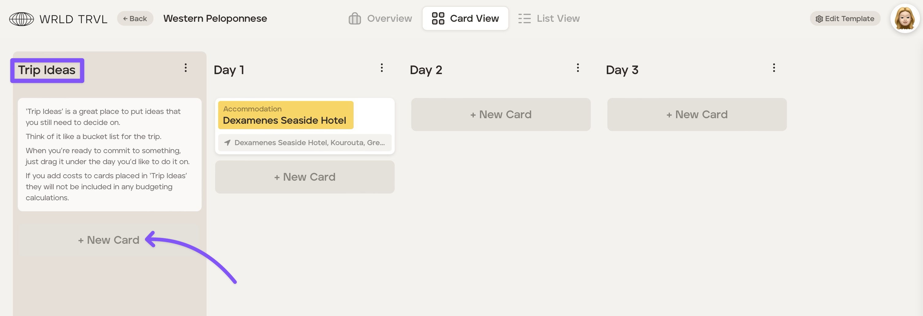 If you have some itinerary ideas which you do not want to place within the template itinerary itself, you can follow the same process of adding cards in the ‘Trip Ideas’ column on the left-hand side of the screen.