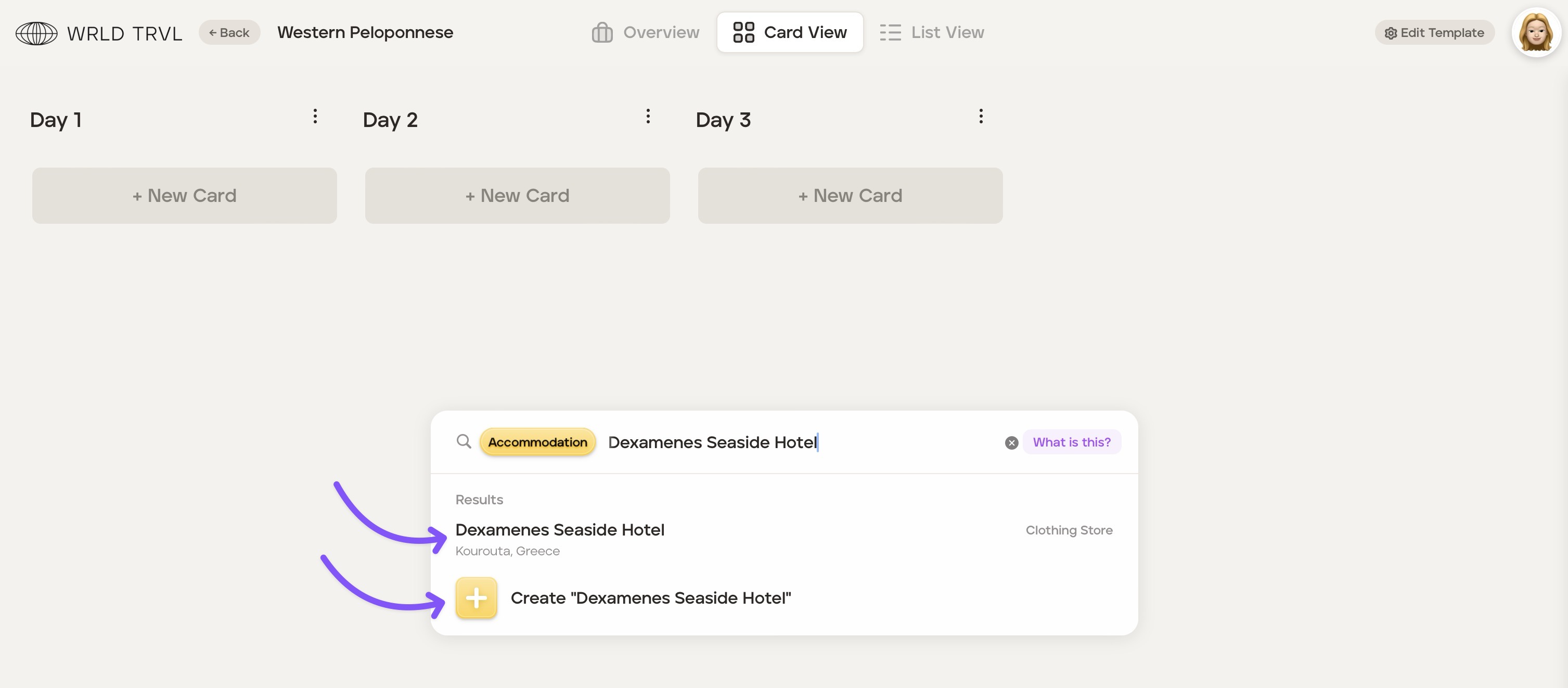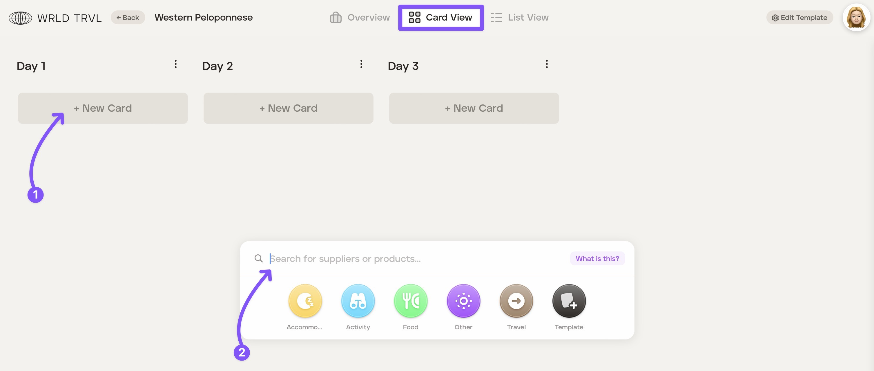 To add itinerary cards to a template itinerary using card view, follow the steps below.