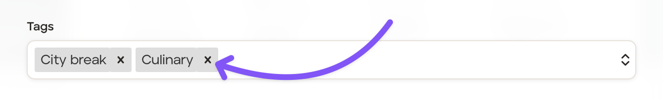 In the 'Tags' field remove tags by clicking the 'x' next to the specific tag you wish to remove. Even if the tag is deleted from the template itinerary, the tag will still remain in the drop-down menu for future selection.