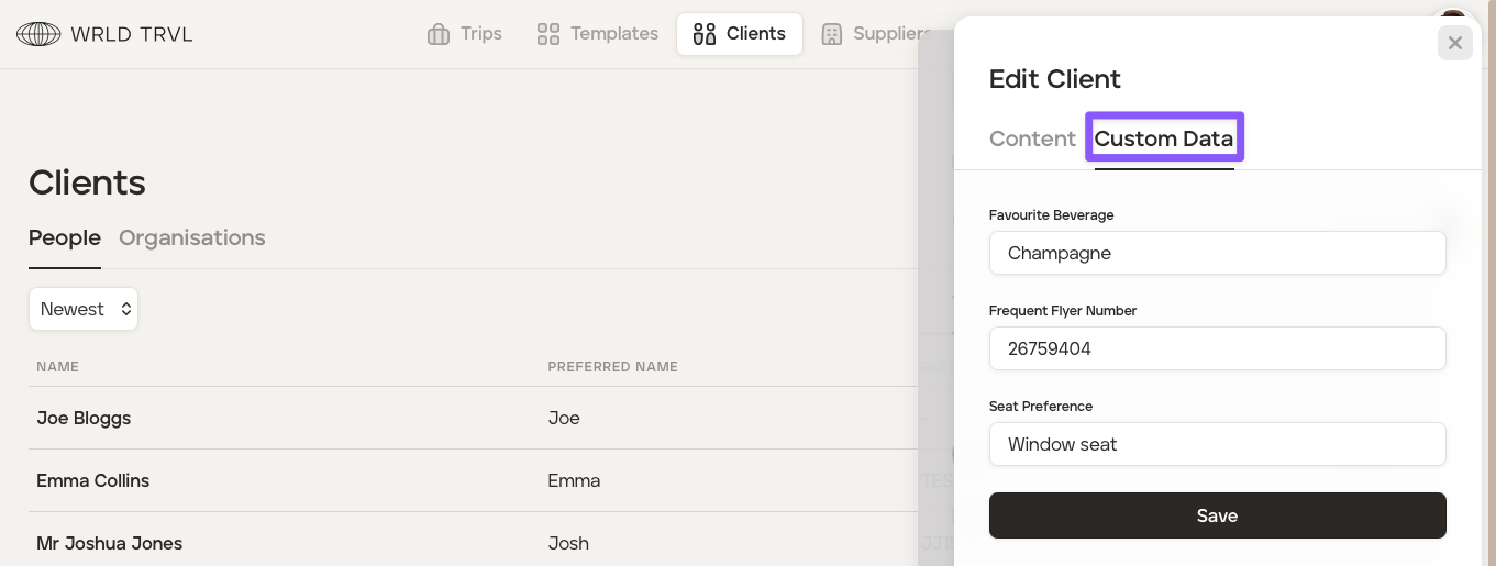 Click the 'Custom Data' tab, input the information in the custom fields you created and click the 'Save' button.