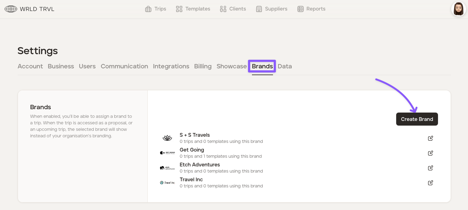 In the 'Brands' tab you can customise and brand your digital and PDF travel itineraries with your business partners' logos, contact details and brand colours. This feature is particularly useful for tour operators and DMCs dealing directly with travel agencies.