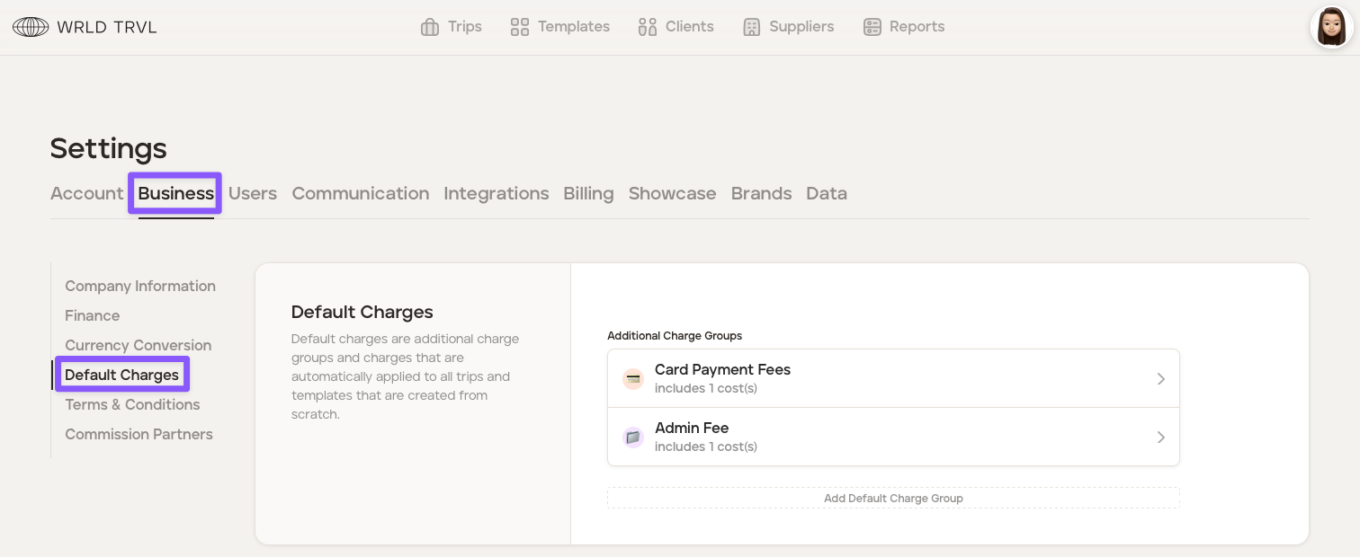 To set up default charges, follow the steps in the Apply default additional costs across all your itineraries article. Example in the screenshot below: