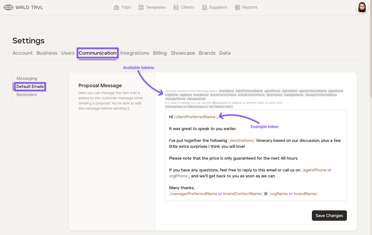 Edit the text in each of the emails as you wish, using the tokens available (for example, [clientName] or [agentName]) for the relevant email. Once done click 'Save Changes'.