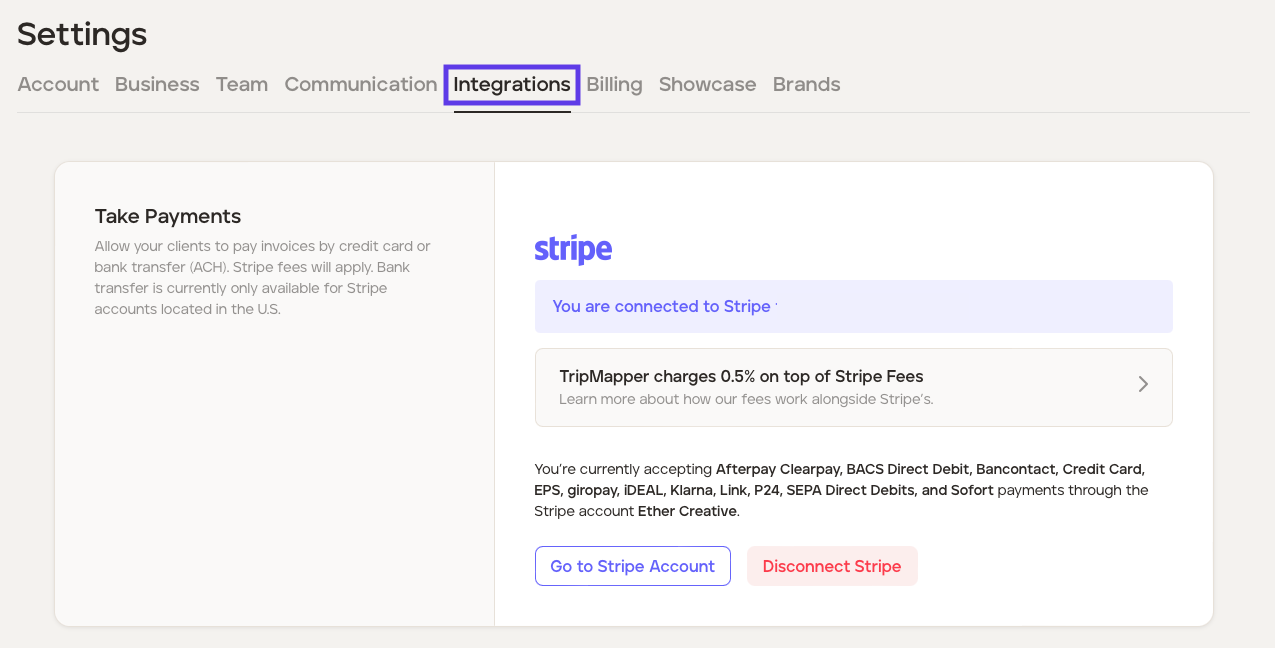 You can double-check that you’re set up by going into your Stripe Settings > Business Settings > Installed apps. TripMapper should be listed in your list of Connect Extensions. The TripMapper for Business platform will also confirm you are connected to Stripe.
